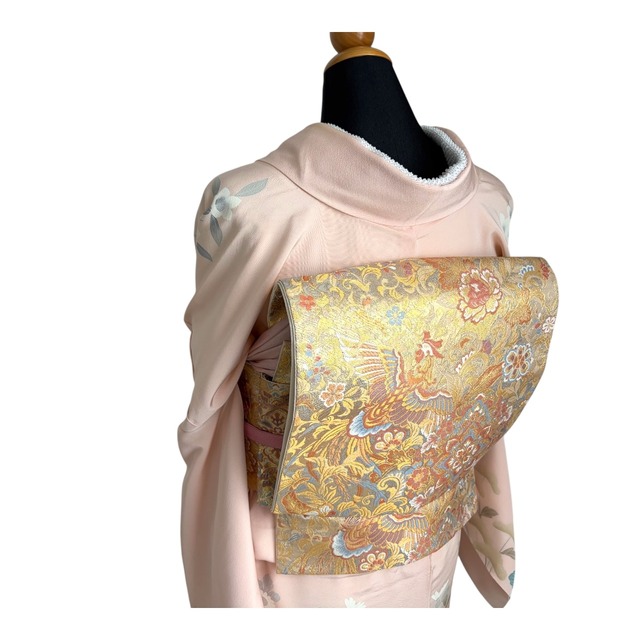 30年程前の新品・未使用の袋帯を二部式の軽装・二重太鼓に仕立てました。 金糸の鳳凰や花紋様で一杯の華やかな帯です。留袖、訪問着・色無地など格式のある席に着用頂けます。 *一部の写真でハレーションが起きている物があります。見づらくて申し訳ありません。 【コーディネイト】 綺麗なピンクの訪問着に合わせました。同系色のピンク系の帯揚・帯〆でまとめました。 【作り】 一本の袋帯をお太鼓部分と胴回り部分に切り離して作っています。簡単に着付けて気軽にお出掛けできるように作りました。 【着用の仕方】 胴に帯を二周巻き付けて頂き、付いている紐で結びます(ひもは上位置に付いています)。背中にお太鼓部分を背負って頂きますが、お太鼓部分にプラスチック製の留め具も付いていますので(写真9枚目)、簡単に着装できます。着装ガイドも付いています。 【素材】 帯-正絹、紐-正絹、帯留め具-プラスチック 【サイズ】 お太鼓部分:高さ約29cm+垂れ先約8cm×お太鼓巾約30.5cm 胴部分:長さ約205cm×巾約15.5cm *帯枕ご希望の場合は別ページにてご注文下さい。 こちらの帯枕に合わせて軽装帯を作っています。 帯枕サイズ:タテ約7.5cm×ヨコ約20cm×厚さ約4.5cm(あずま姿No140の帯枕になります:本体ウレタン芯、紐ガーゼ長さ約150cm) *他サイトでも販売しているため、在庫切れになる場合があります。ご了承下さい。