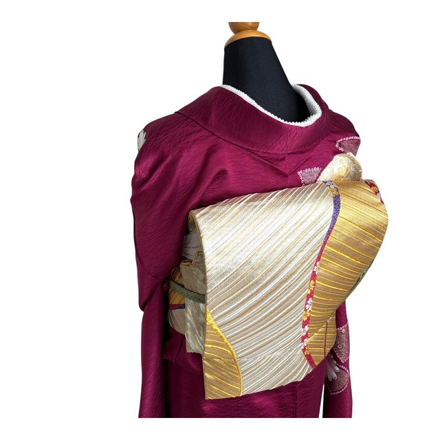 正絹のアンティークの帯地を名古屋帯に仕立てました。 帯芯を入れた手縫いの名古屋仕立です。(通常の名古屋帯はボディに着用させず平置きで撮影するのですが、日の出を思わせる素敵な帯ですので今回だけ軽く着用させ撮影しました) お太鼓と正面に朱色の円が出ます。正面部分の地は箔で右脇から左脇までで、円はほぼ中心に来るようにしなけれはいけないポイント柄です。柄の鳥部分に螺鈿が使われています。 【帯サイズ】総丈:約363cm お太鼓部分:巾約31cm × 長さ約113cm 手先部分:巾約15.5cm × 長さ約250cm *帯枕ご希望の場合は別ページにてご注文下さい。 こちらの帯枕に合わせて軽装帯を作っています。 帯枕サイズ:タテ約7.5cm×ヨコ約20cm×厚さ約4.5cm(あずま姿No140の帯枕になります:本体ウレタン芯、紐ガーゼ長さ約150cm) *他サイトでも販売しているため、在庫切れになる場合があります。ご了承下さい。