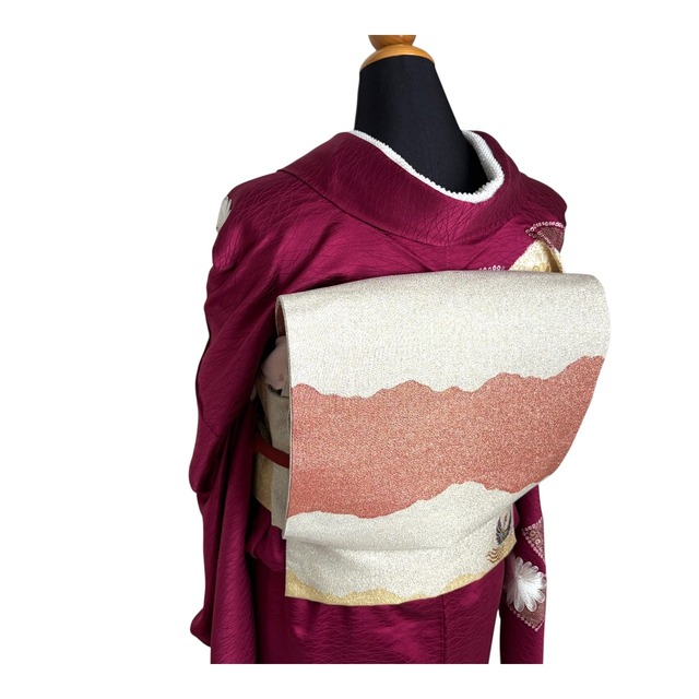 30年程前の新品・未使用の袋帯を二部式の軽装・二重太鼓に仕立てました。 銀糸ベースに赤と金糸の太い曲線ラインが交互に織られています。主に出る部分は赤い方です。垂先に鳳凰が刺繍されています。 帯芯の入っていない軽い帯です。留袖、訪問着・色無地など格式のある席に着用頂けます。 【コーディネイト】 葡萄色の訪問着に合わせました。ピンクと臙脂系の帯揚・帯〆でまとめました。 【作り】 一本の袋帯をお太鼓部分と胴回り部分に切り離して作っています。簡単に着付けて気軽にお出掛けできるように作りました。 【着用の仕方】 胴に帯を二周巻き付けて頂き、付いている紐で結びます(ひもは上位置に付いています)。背中にお太鼓部分を背負って頂きますが、お太鼓部分にプラスチック製の留め具も付いていますので(写真9枚目)、簡単に着装できます。着装ガイドも付いています。 【素材】 帯-正絹、紐-正絹、帯留め具-プラスチック 【サイズ】 お太鼓部分:高さ約30cm+垂れ先約8cm×お太鼓巾約31cm 胴部分:長さ約220cm×巾約15.5 *帯枕ご希望の場合は別ページにてご注文下さい。 こちらの帯枕に合わせて軽装帯を作っています。 帯枕サイズ:タテ約7.5cm×ヨコ約20cm×厚さ約4.5cm(あずま姿No140の帯枕になります:本体ウレタン芯、紐ガーゼ長さ約150cm) *他サイトでも販売しているため、在庫切れになる場合があります。ご了承下さい。