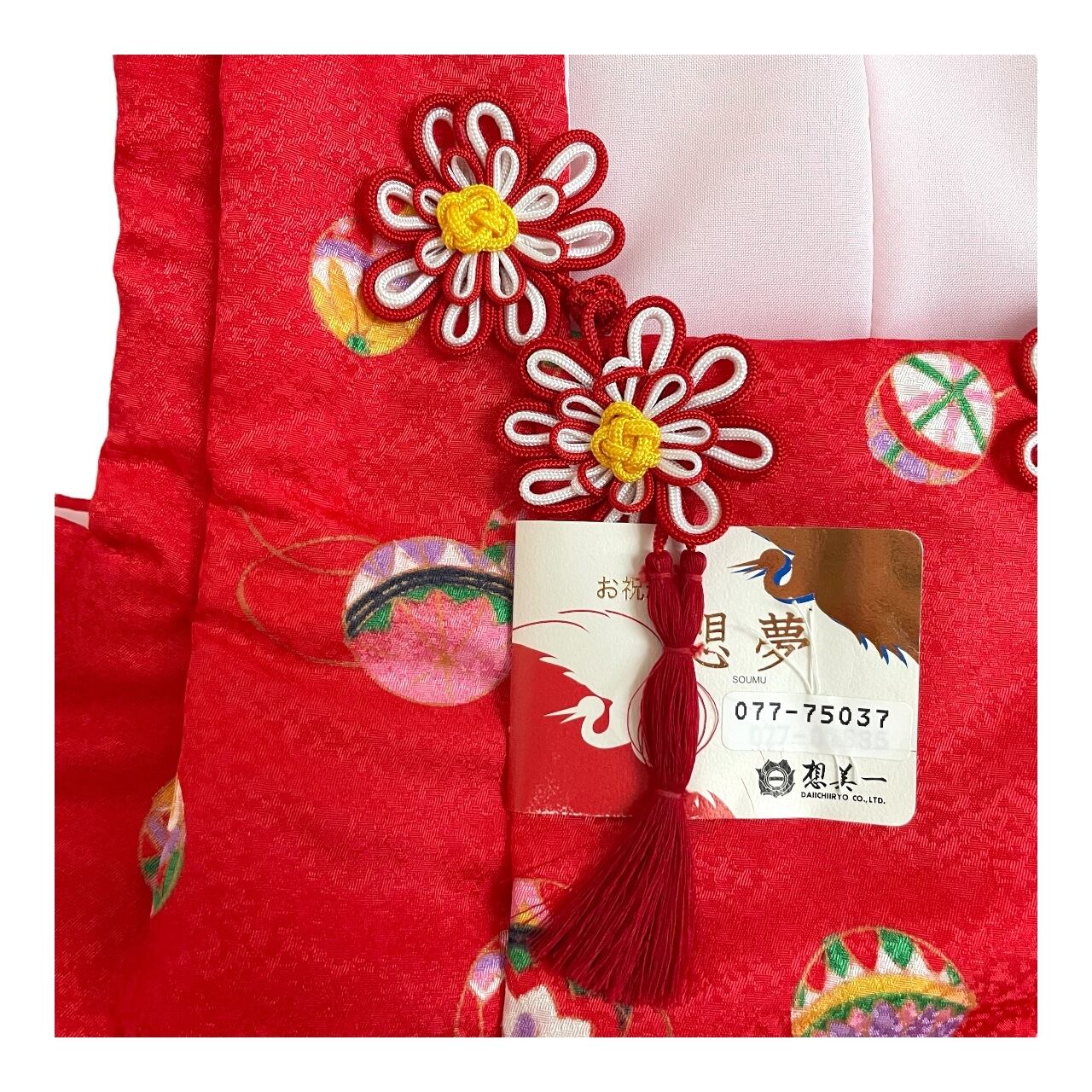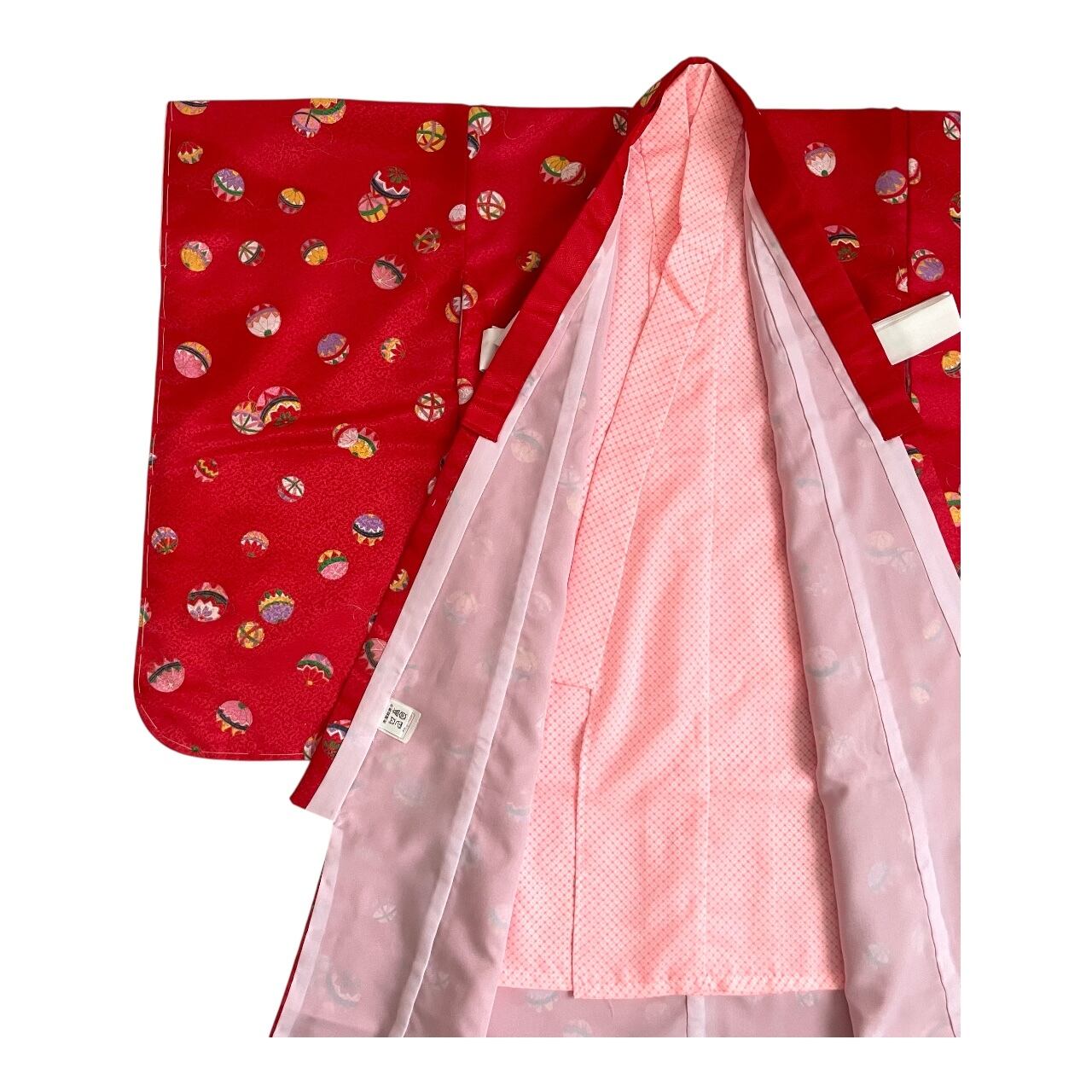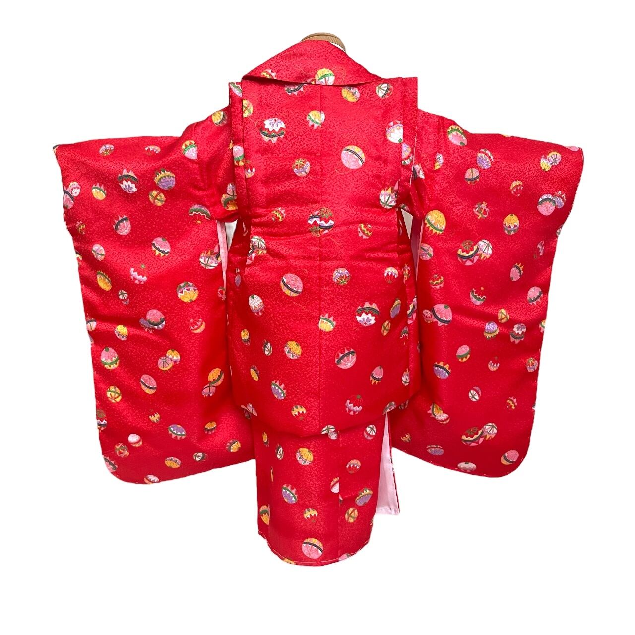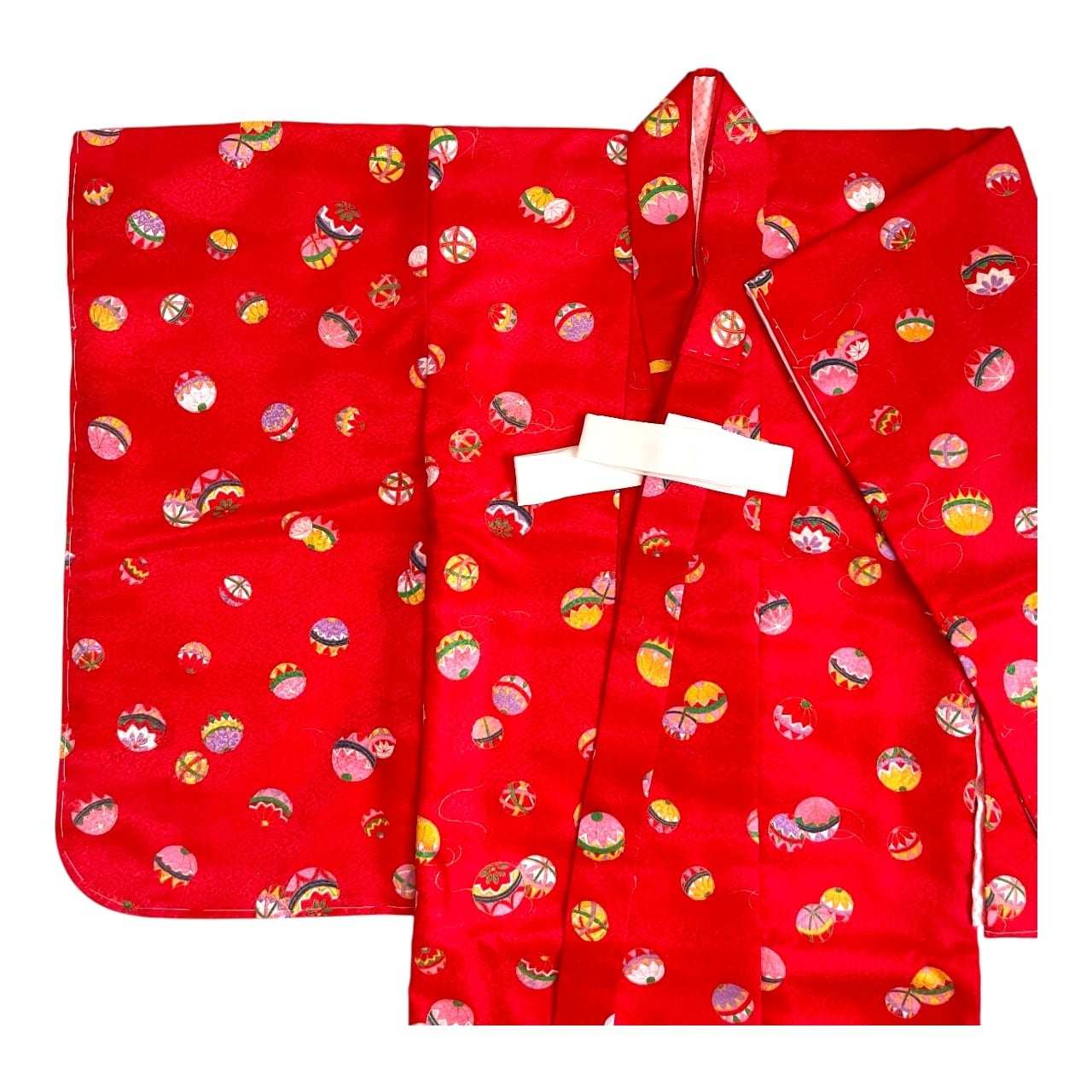 着物・被布・巾着・草履は光沢のある朱子地で、少し朱色掛かった霞んだ赤色、レトロな可愛い手毬柄です。