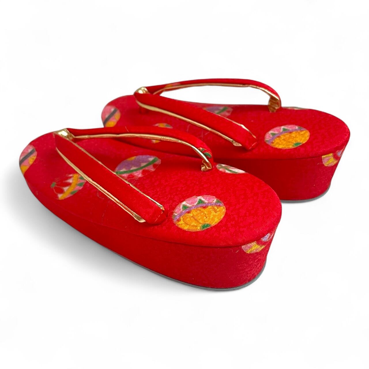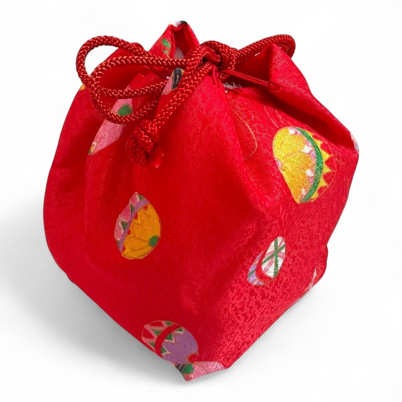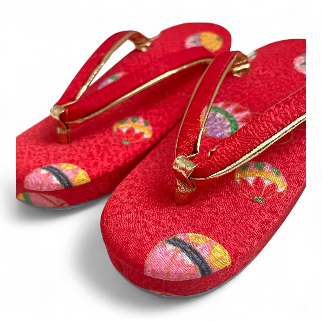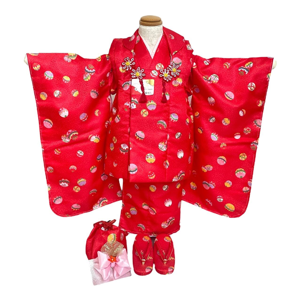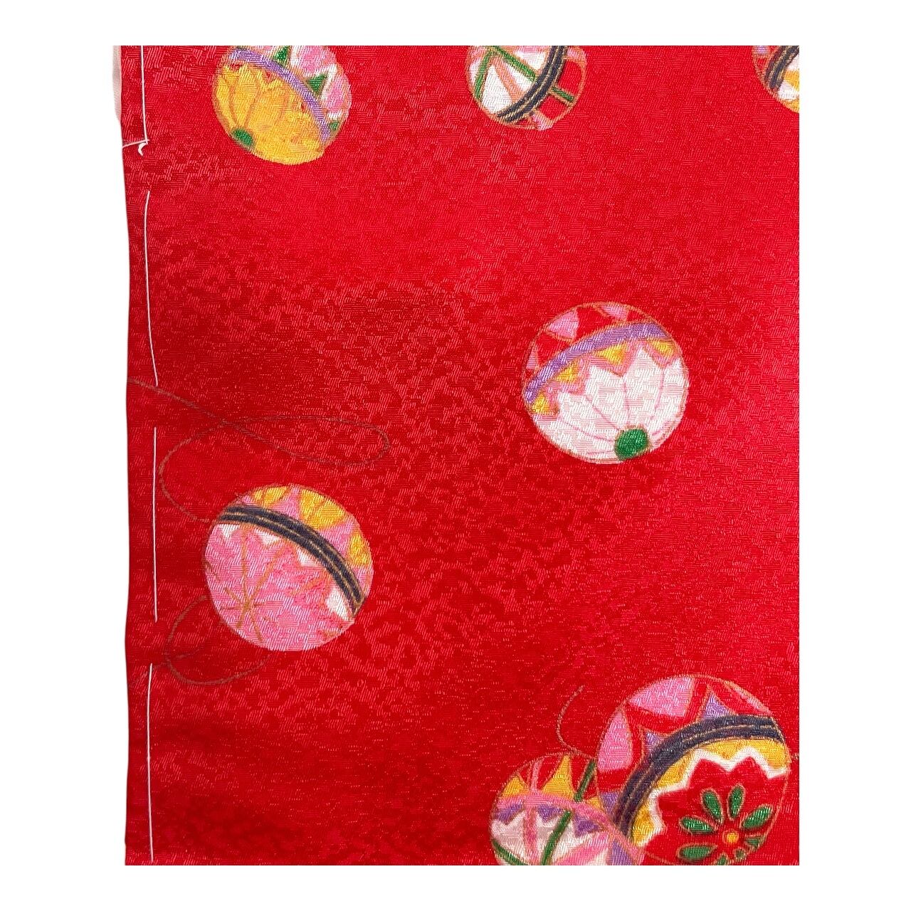 着物・被布・巾着・草履は光沢のある朱子地で、少し朱色掛かった霞んだ赤色、レトロな可愛い手毬柄です。