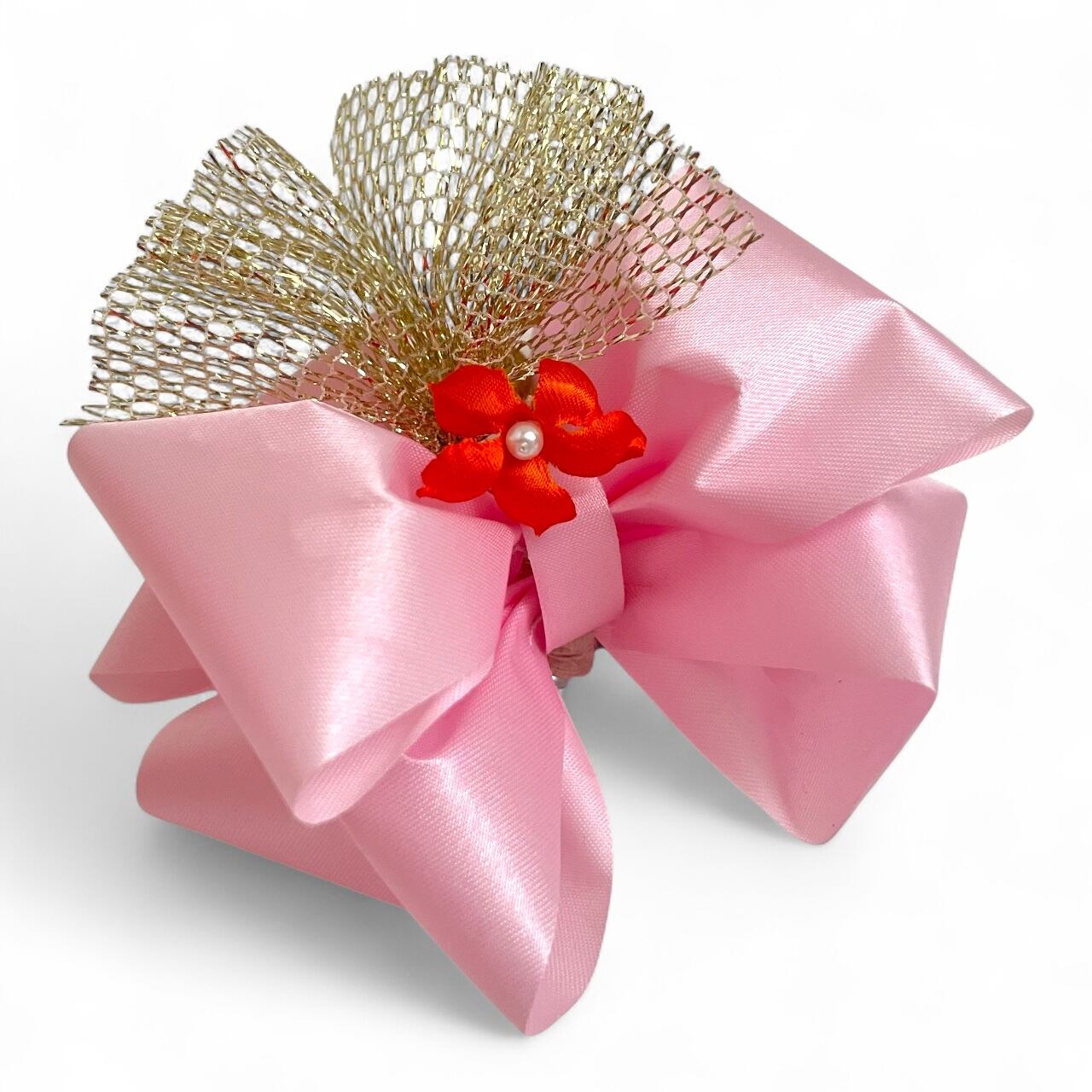 髪飾りは昔懐かしいピンクのリボン、アメリカンピンクで鈴が付いています。