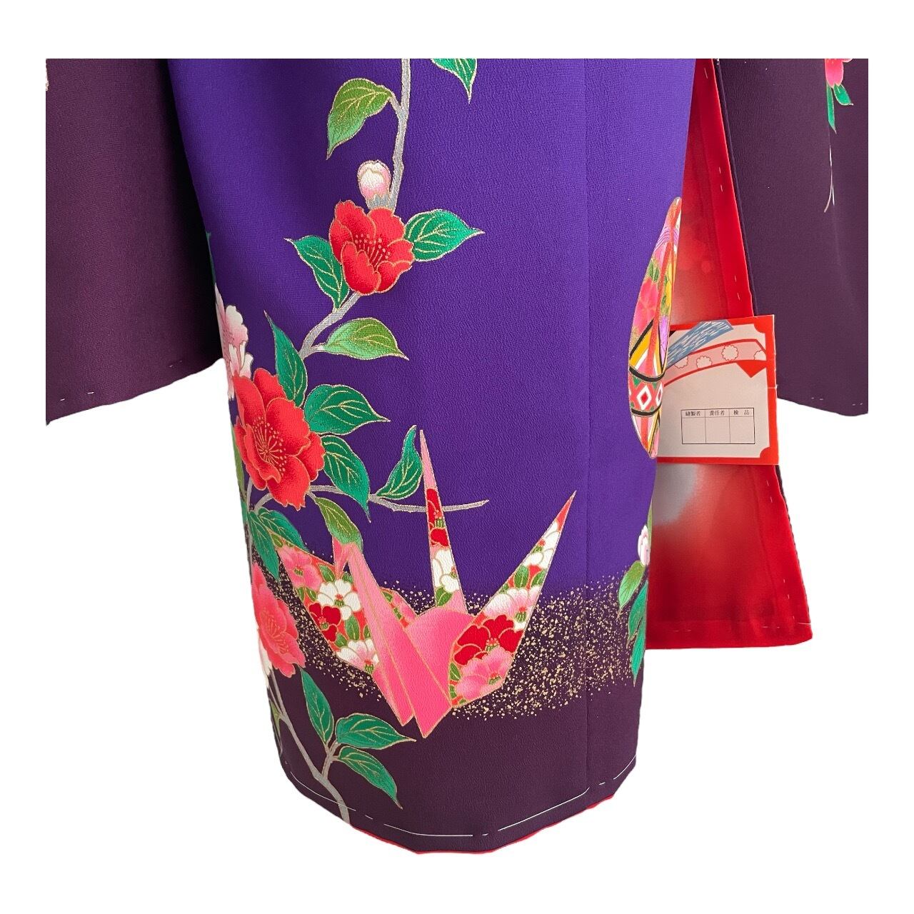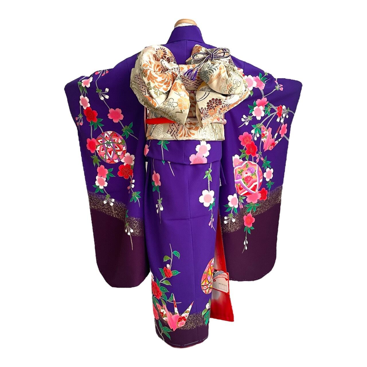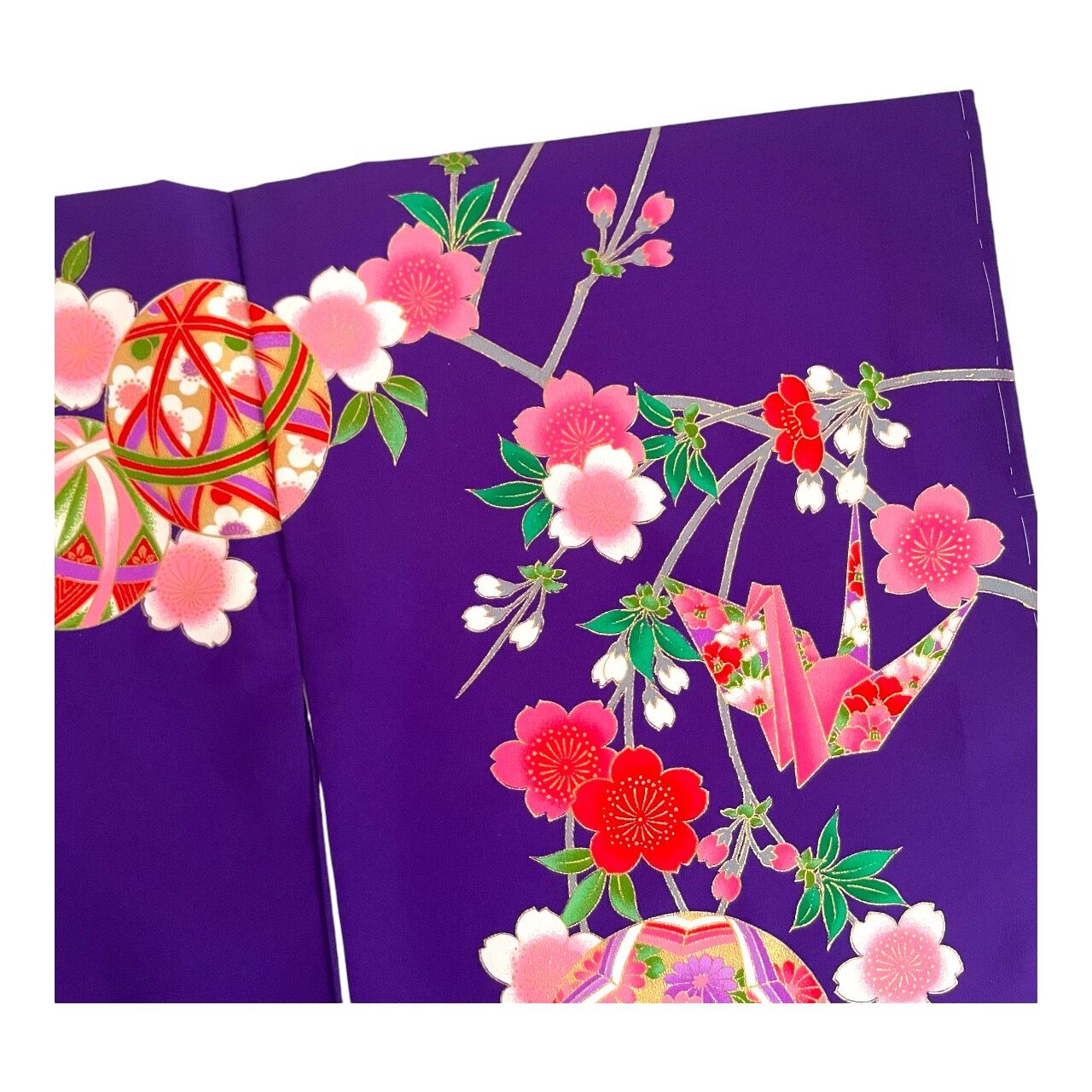 紫の地に鼓・手毬・折鶴などの古典柄で、見頃と裾で色味の違った2色の紫色を使っています。