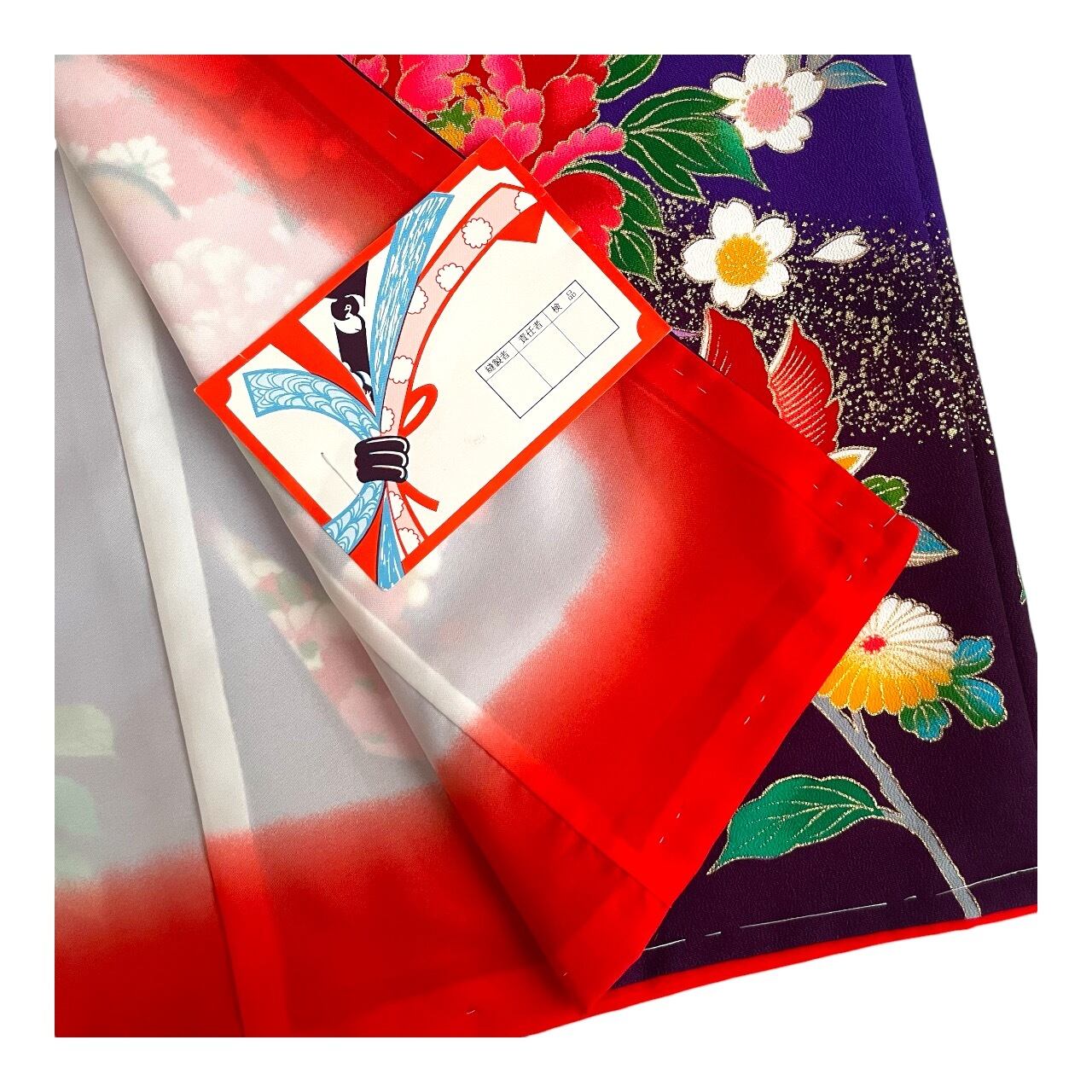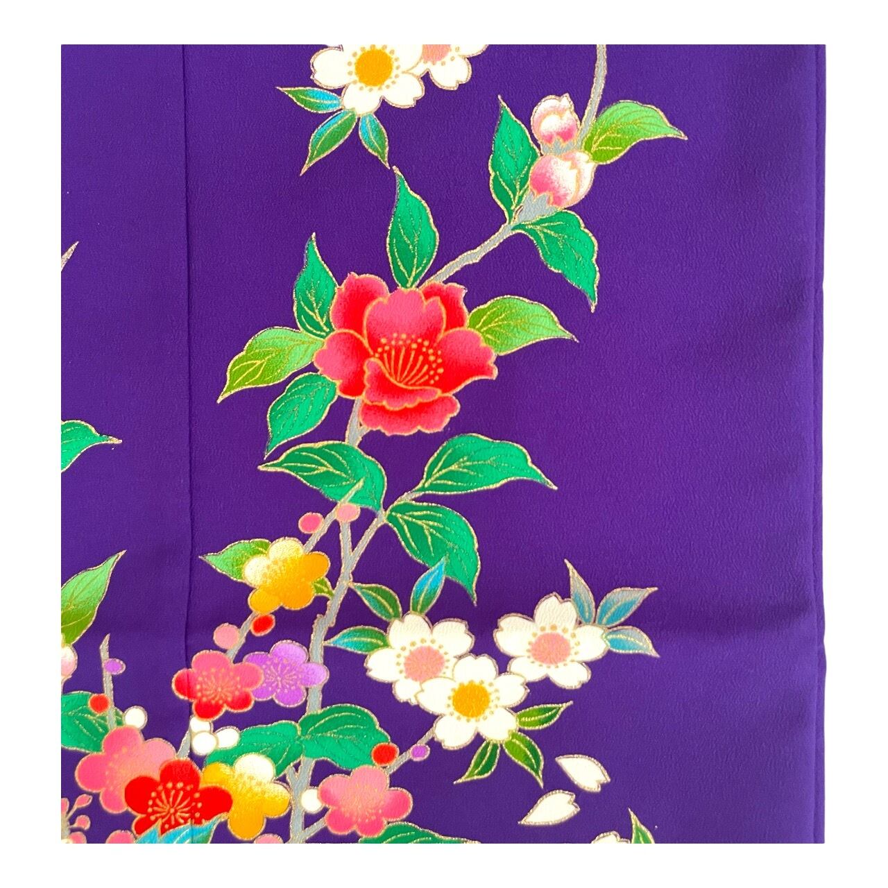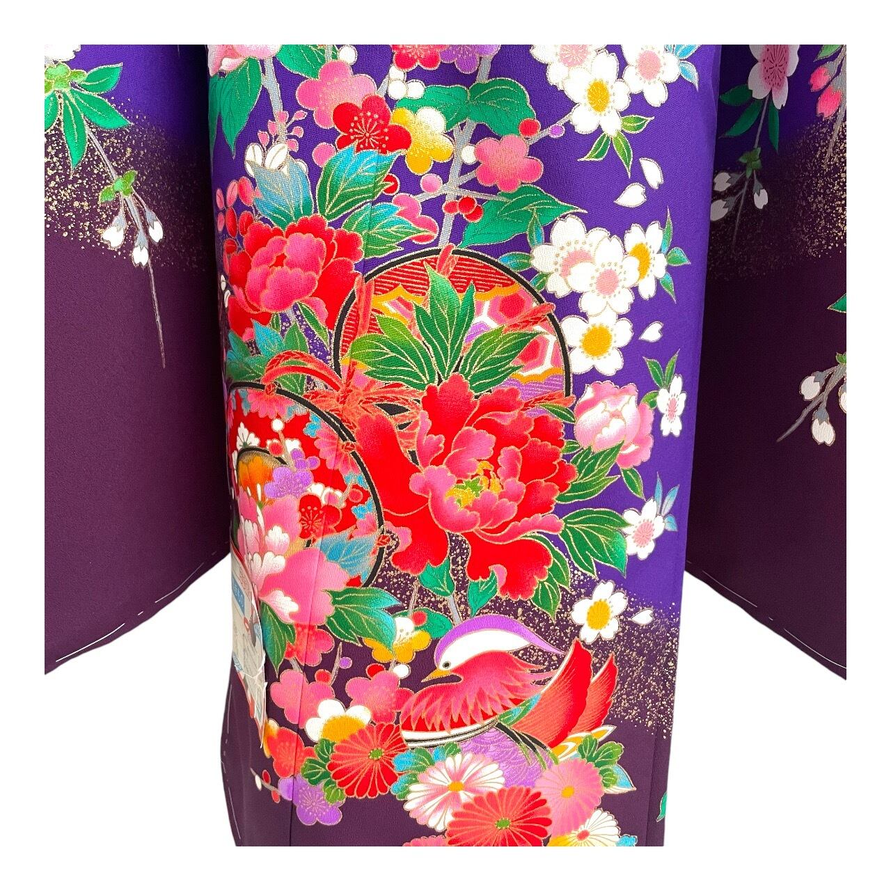 紫の地に鼓・手毬・折鶴などの古典柄で、見頃と裾で色味の違った2色の紫色を使っています。
