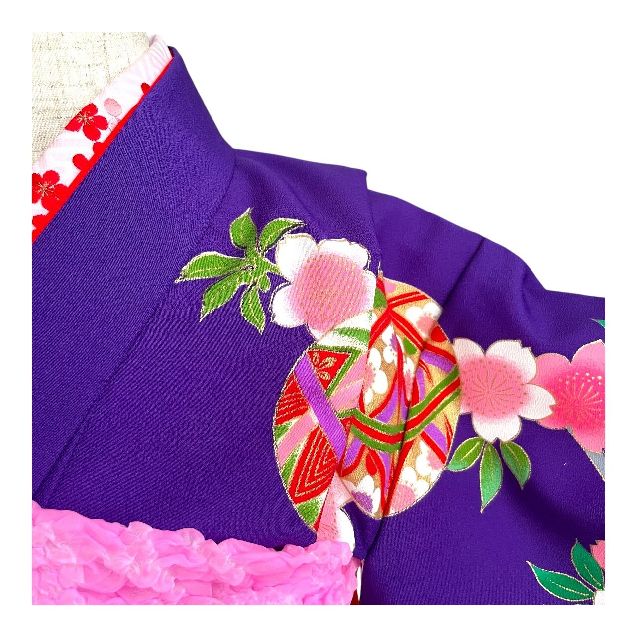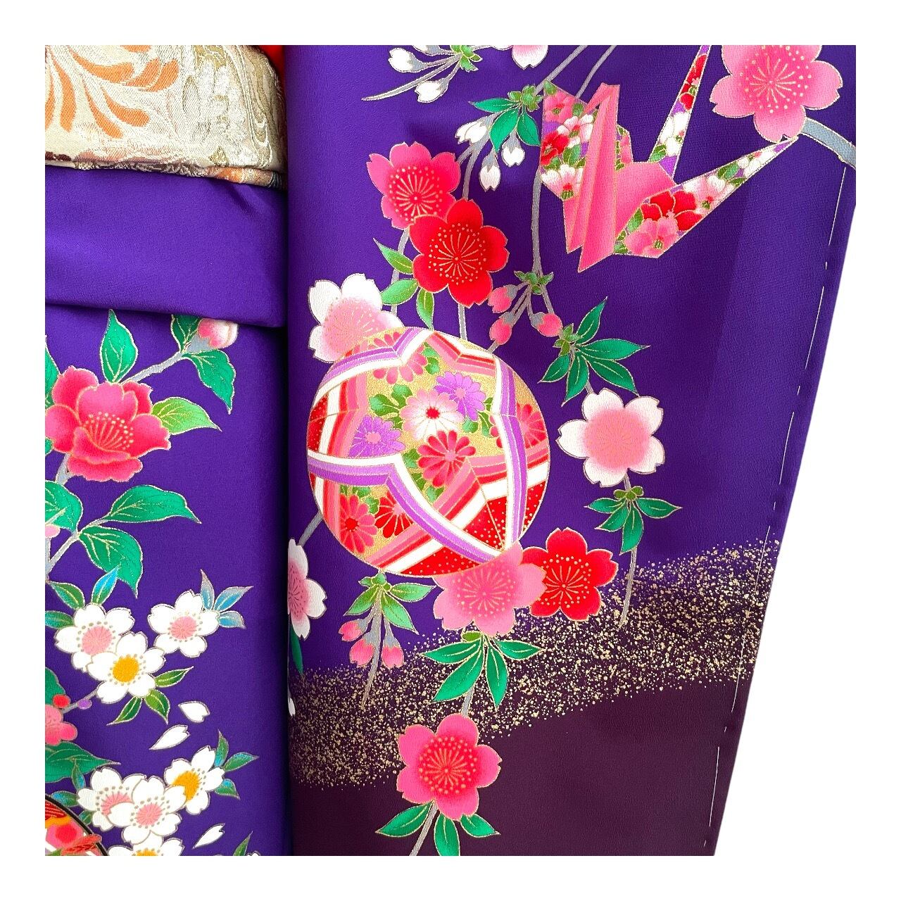#アンティーク #七五三 #7歳 #着物 #和装 #古典柄 #鼓 #手毬 #折鶴 #紫