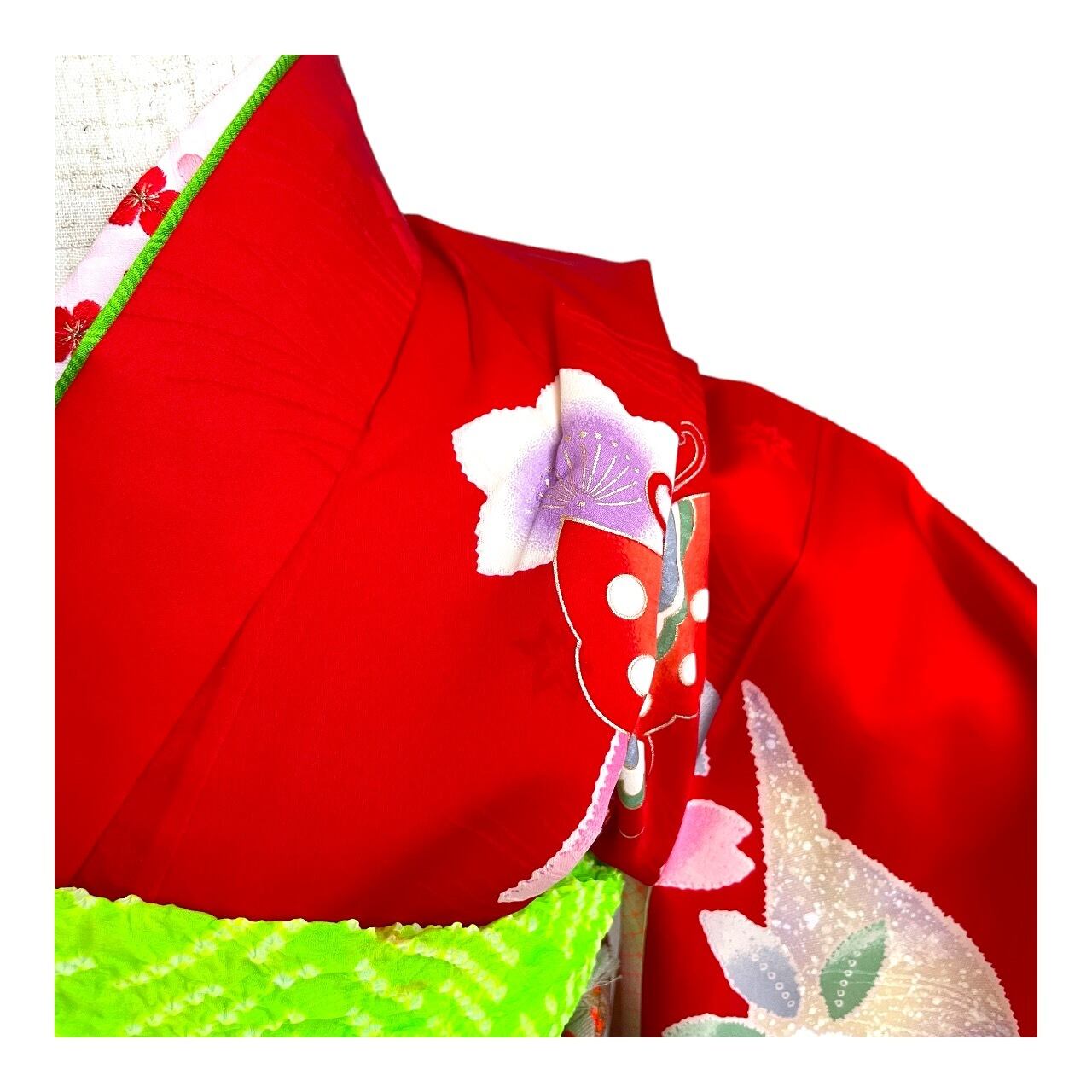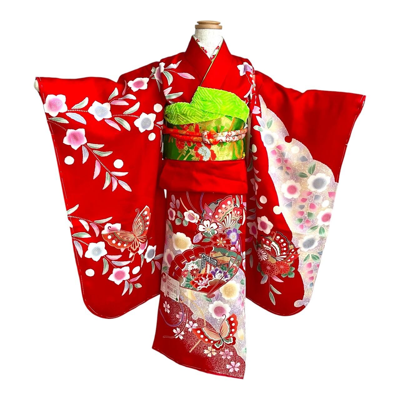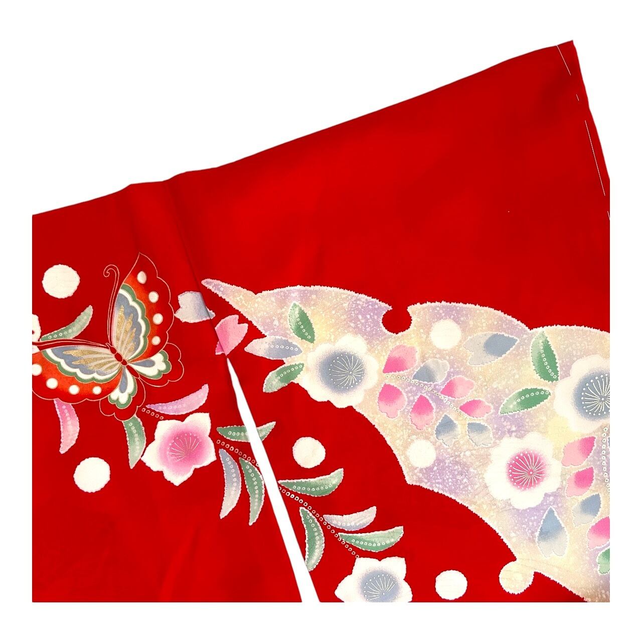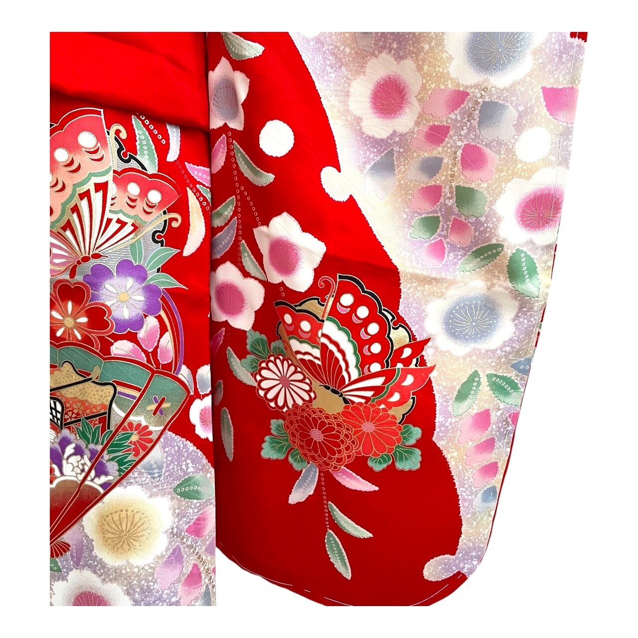 真っ赤な地に扇・蝶々・絞りのプリントの趣のある柄付の着物です。
