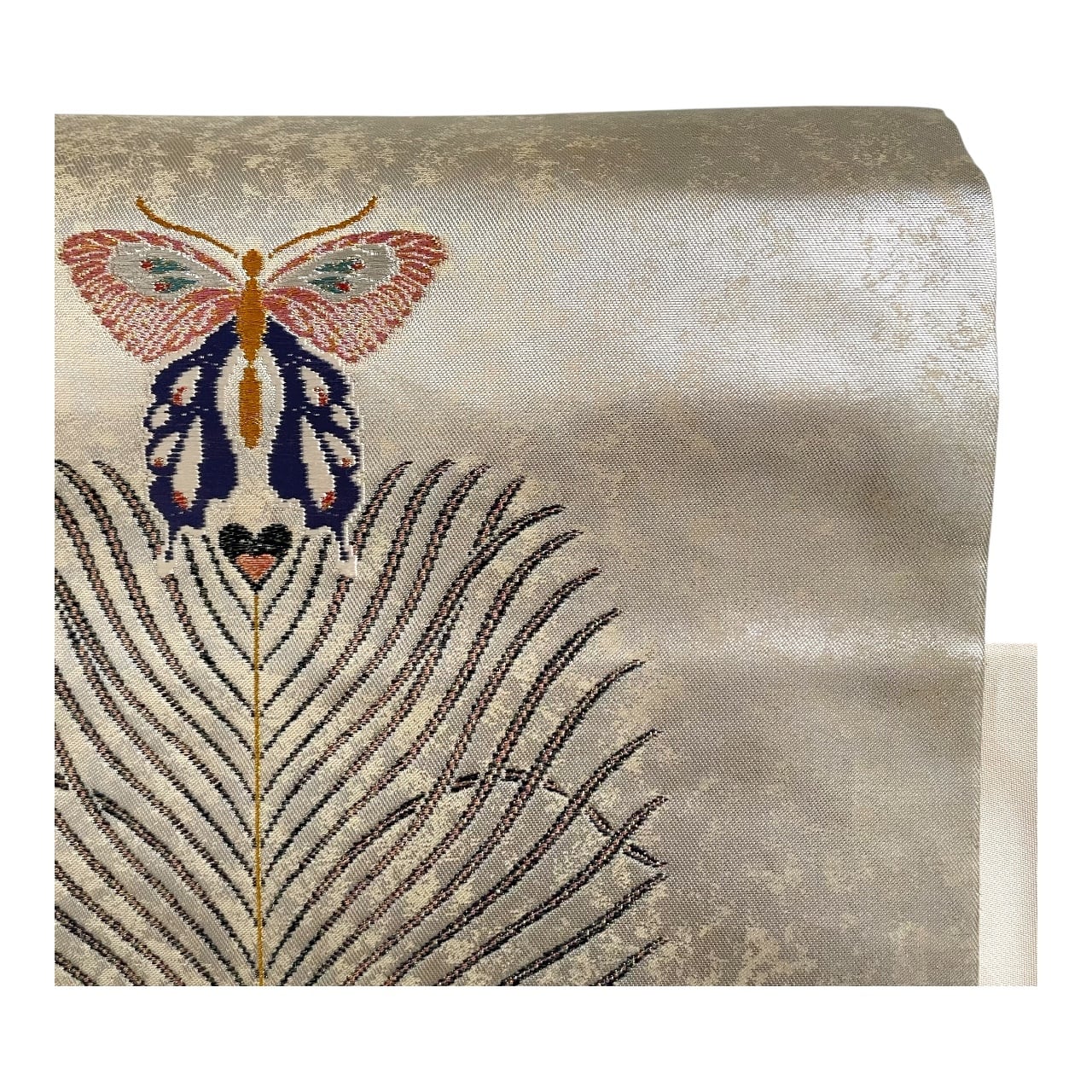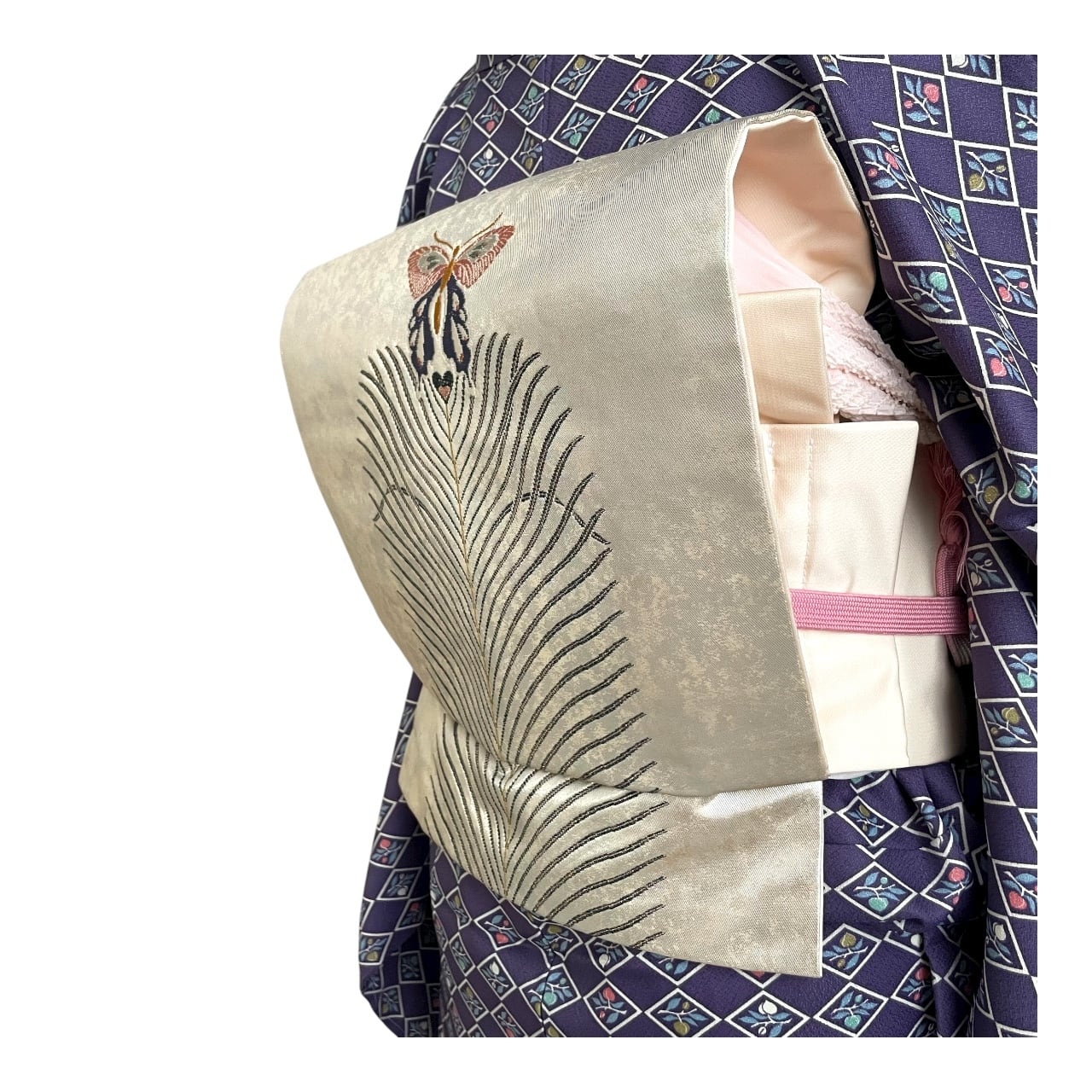 手先から1周目までは無地(裏生地)で、銀箔の地は体の右脇から左脇までしかありません。その銀箔地の中央に1匹の蝶々なので、通常通りで結びで着用すると蝶々を体中央に持って来るのに苦労するかと思いますが、軽装帯なので楽に調節が取れると思います。