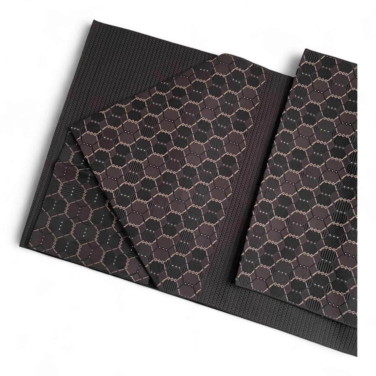 シックな焦茶色に細かい亀甲模様です。小紋や大島などに気軽に着て頂けます。