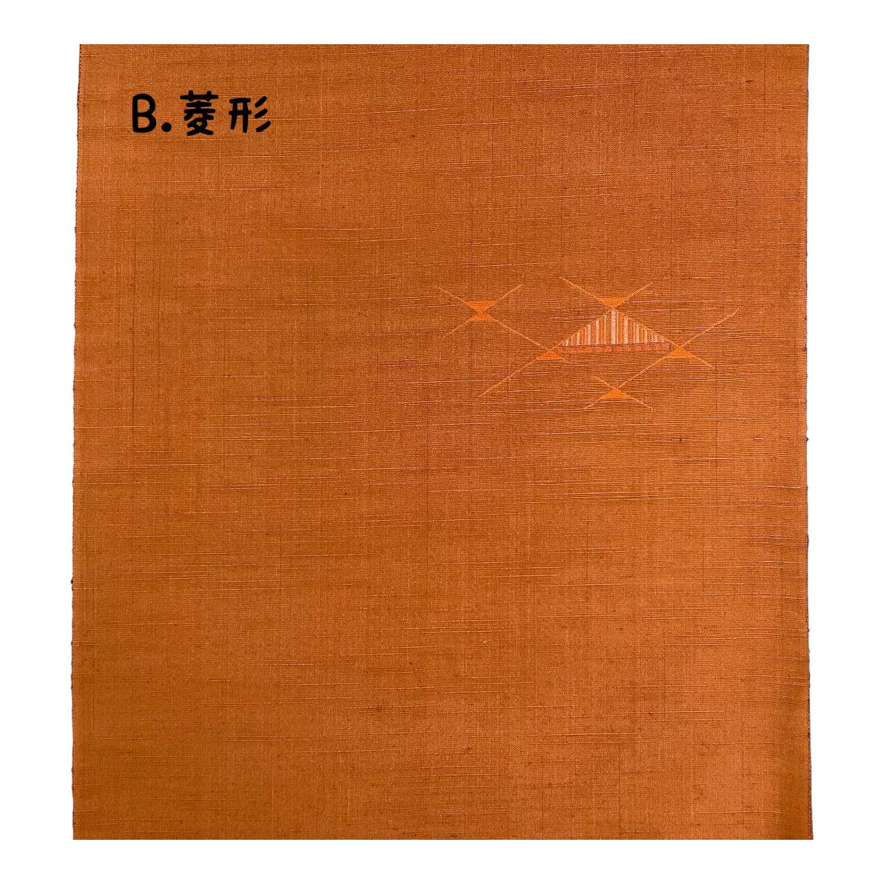 紬の反物です。Aは明るめの朱色、同系色の糸で雲取りのような枠の中に菊のような花が刺繍されています。Bは多少くすんだ朱色、同じく同系色の糸で菱形をアレンジしたような模様が刺繍されています。
