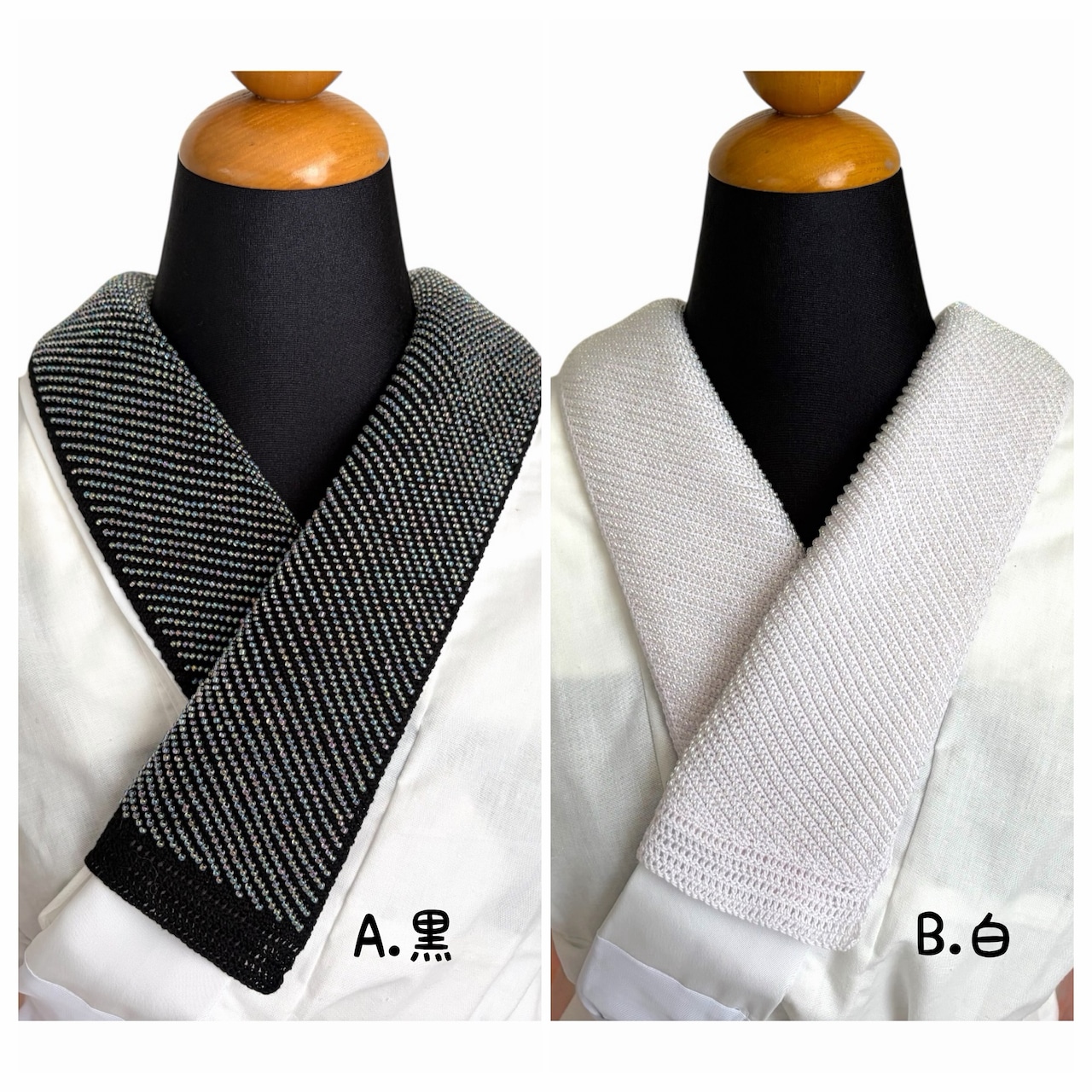 全面ビーズの半衿です。ボリュームがありキララ煌めき、衿元が引き立ちます。Bの白は、真っ白ではなく、少しラベンダー掛かった淡い色合いです。振袖などにお勧めです。