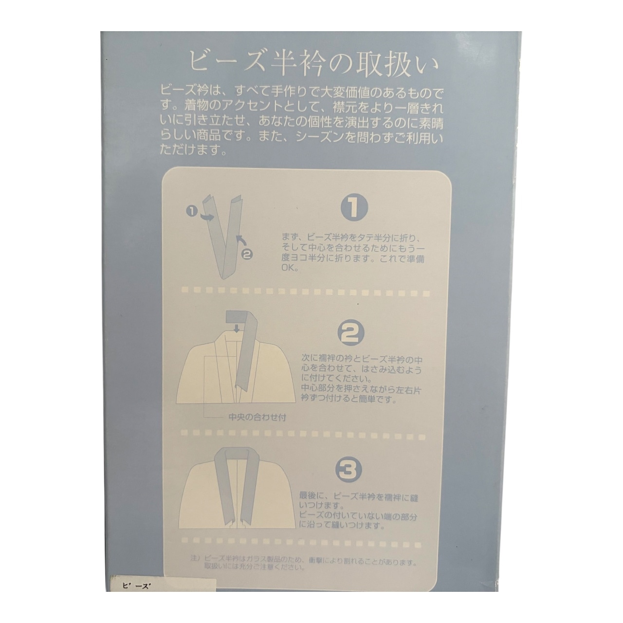箱裏の文面: ビーズ衿は、すべて手作りで大変価値のあるものです。着物のアクセントとして、襟元をより一層きれいに引き立たせ、あなたの個性を演出するのに素晴らしい商品です。また、シーズンを問わずご利用頂けます。