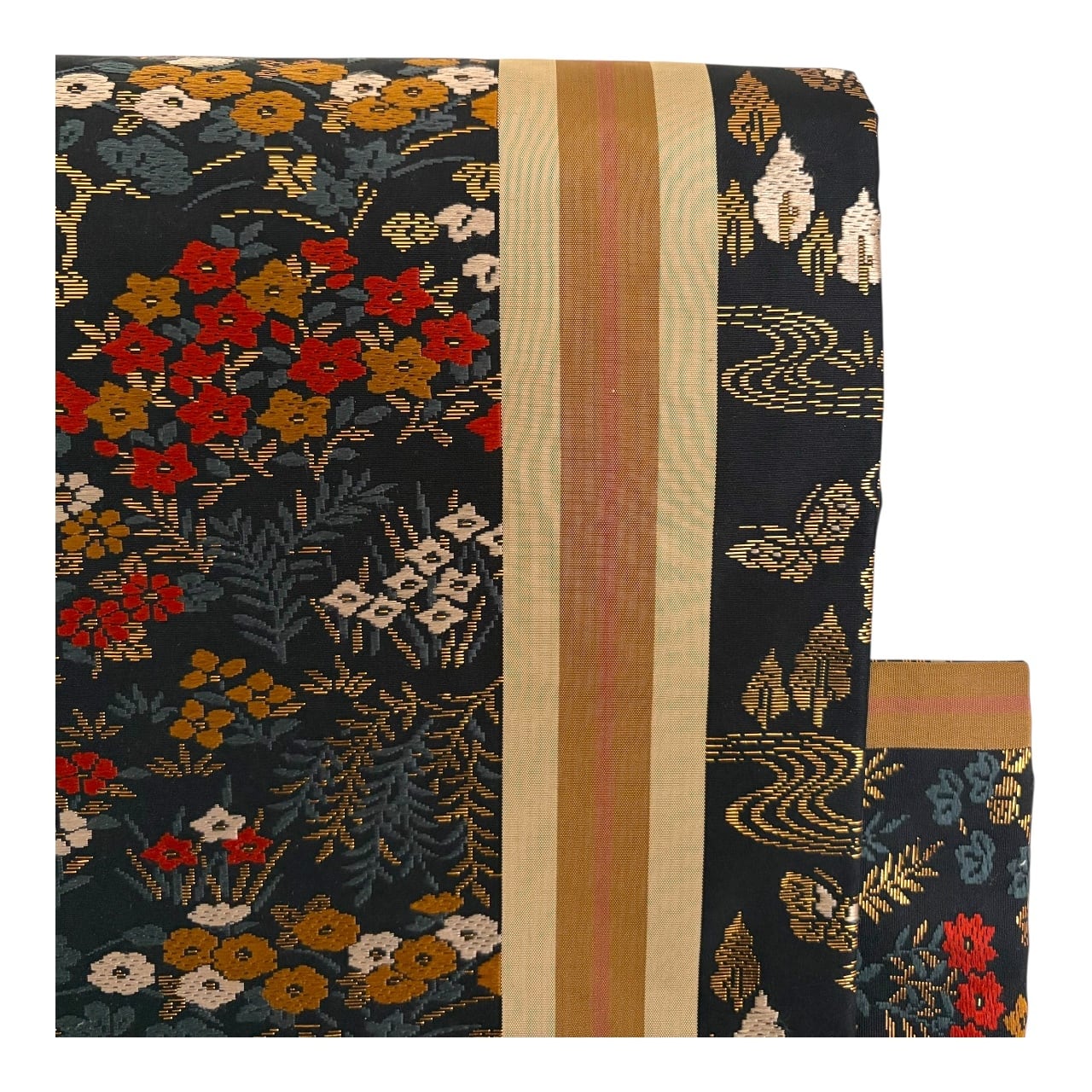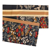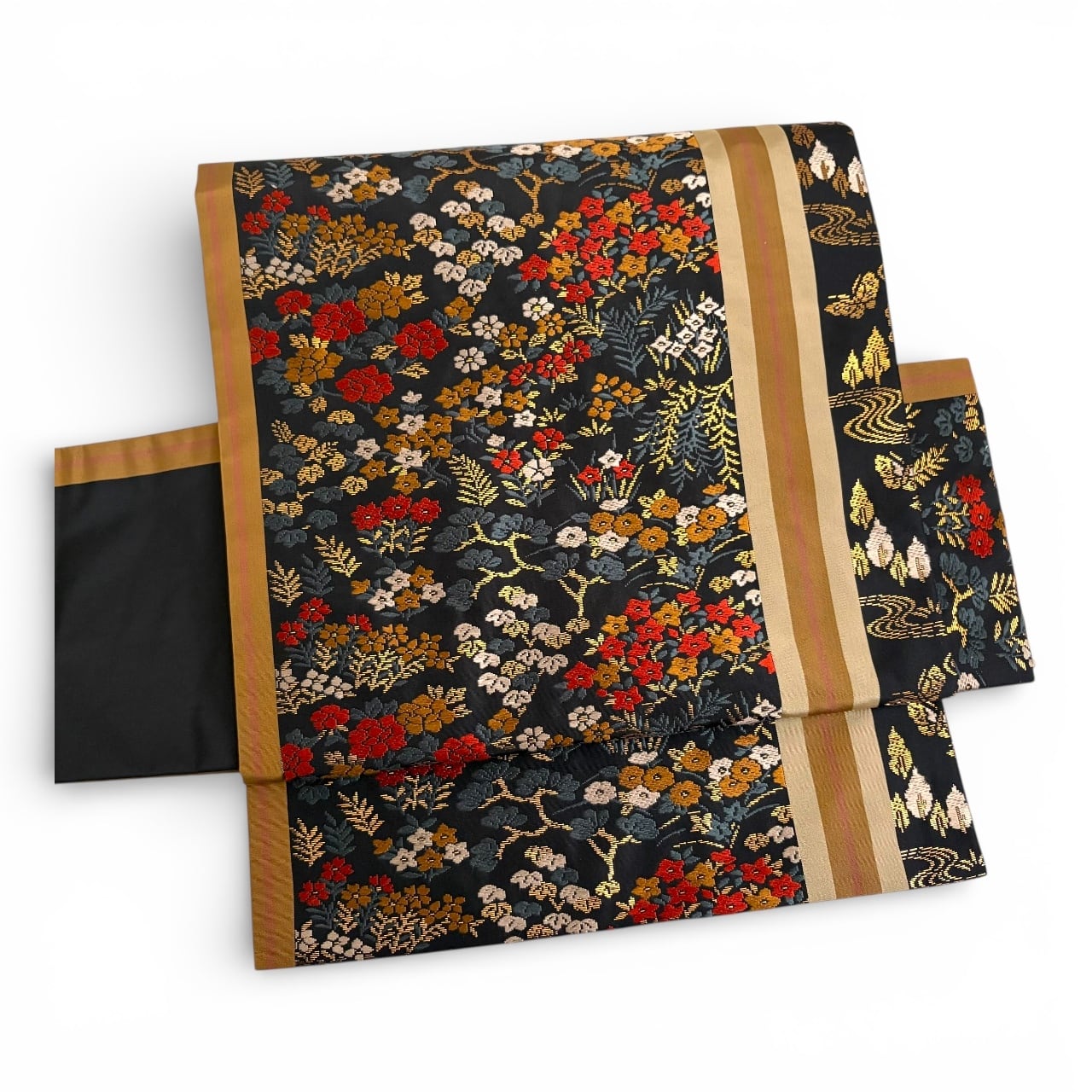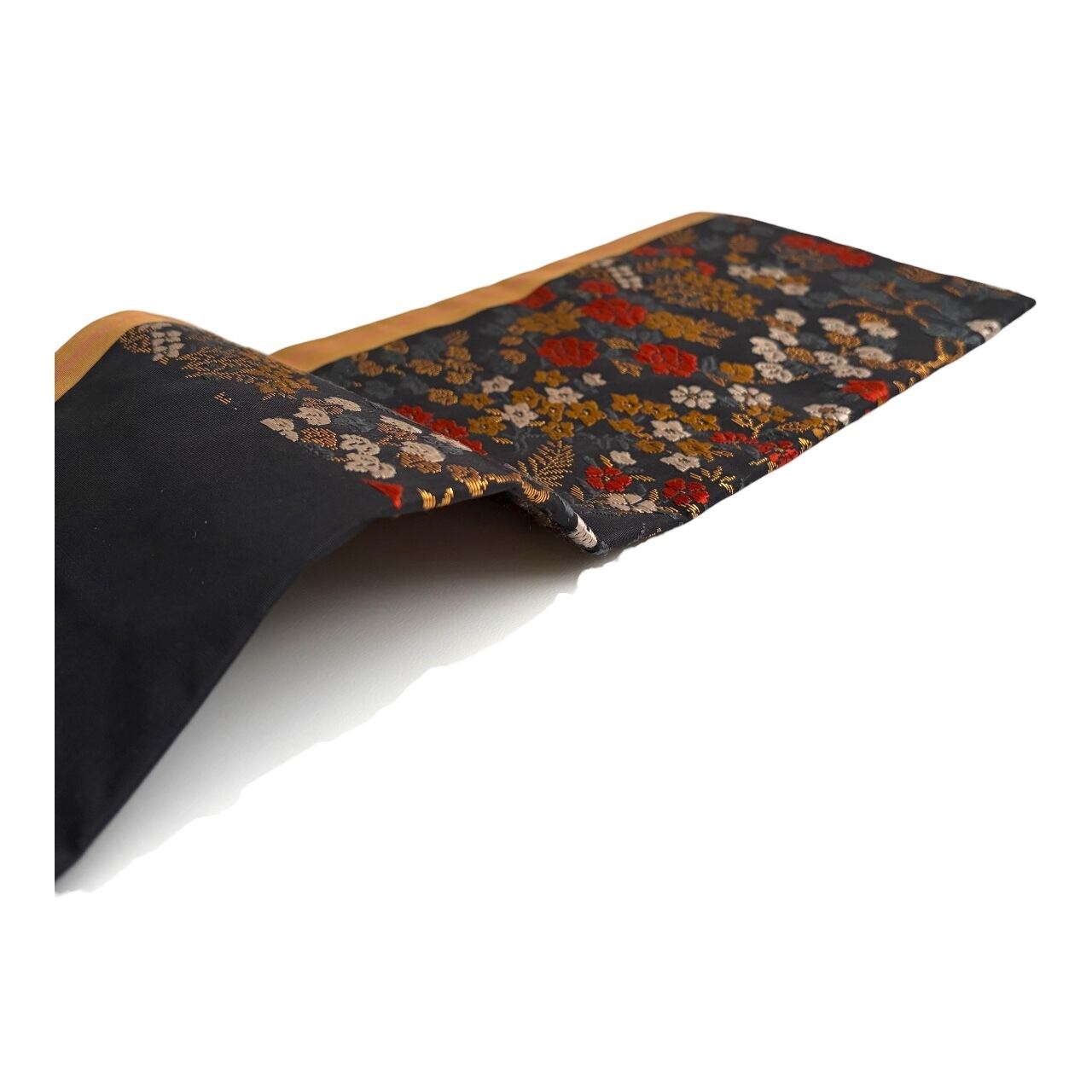 黒地に赤や金糸の四季折々の草花が一面に織り込まれた華やかな帯です。細かい柄なので柄の出方を気にすることなく着用頂けます。柄の端に大小のラインが通っています。ラインが目立たない方をお好みでしたら、手先から反対に巻いていただく必要があります。