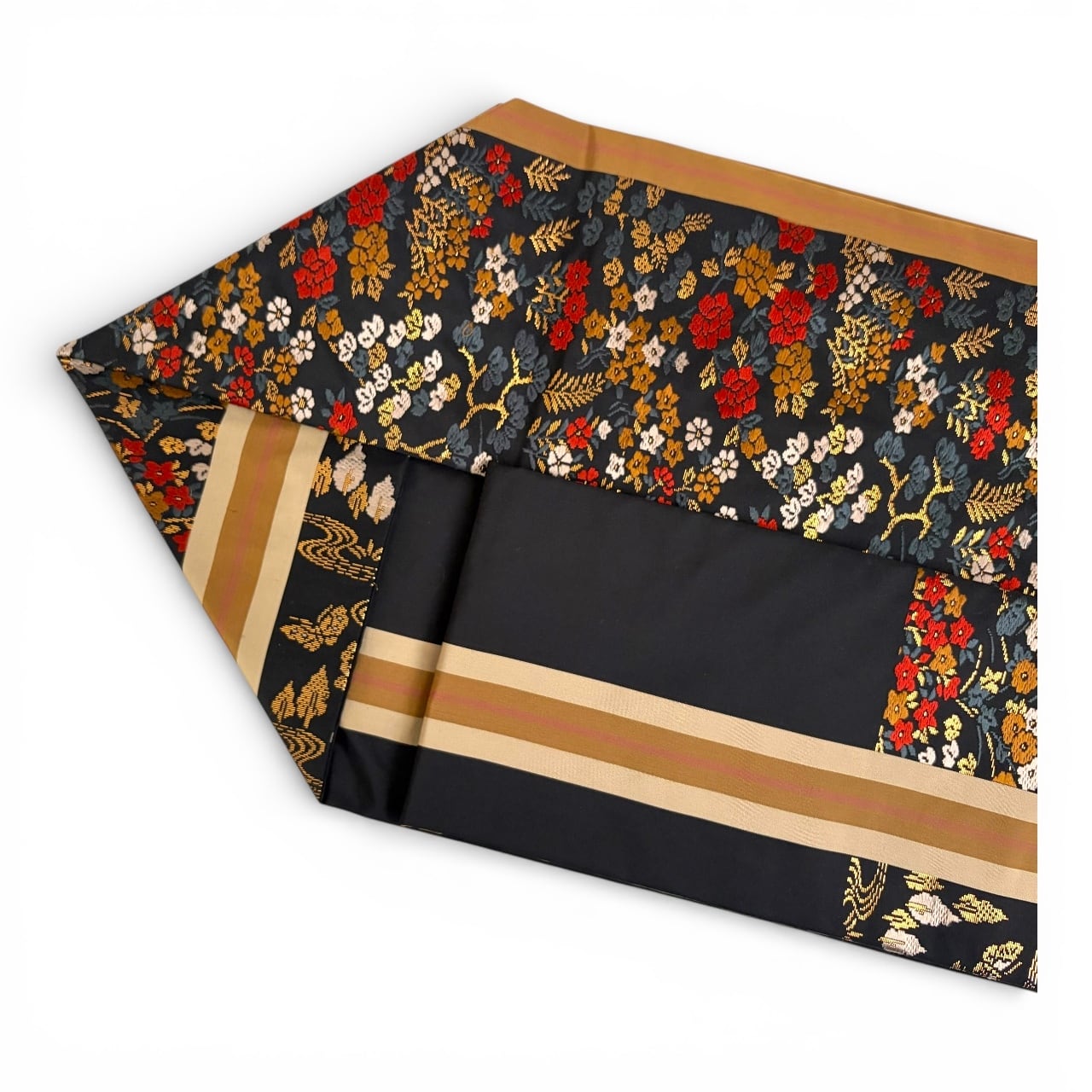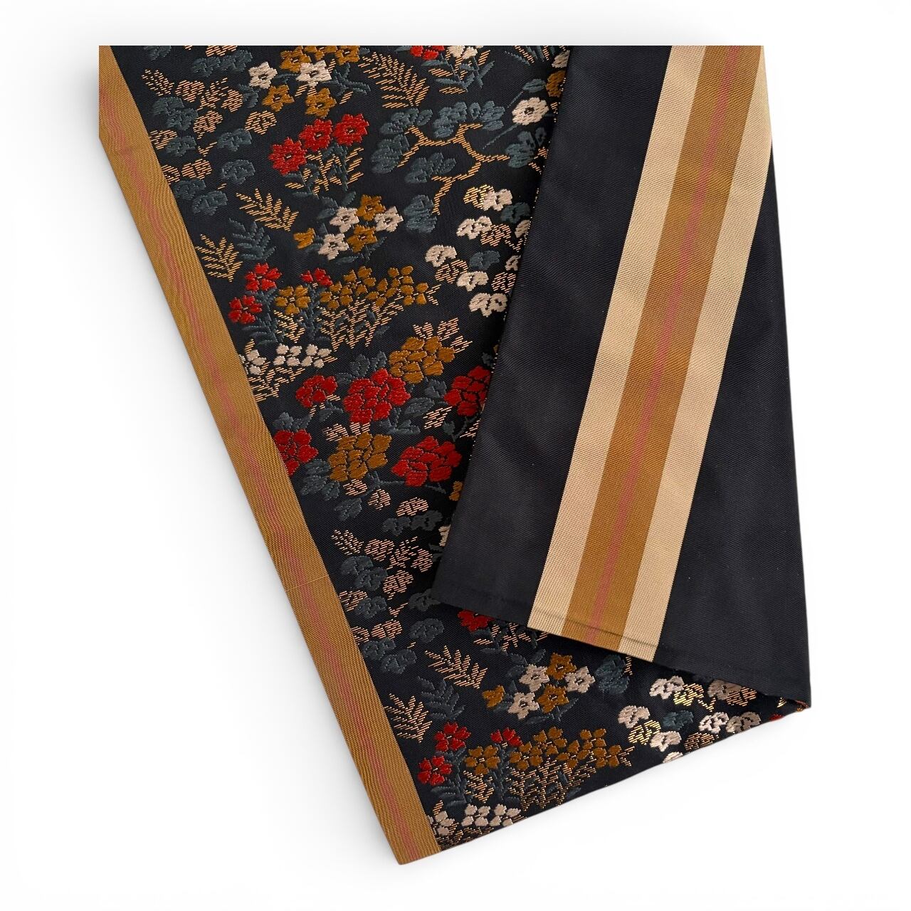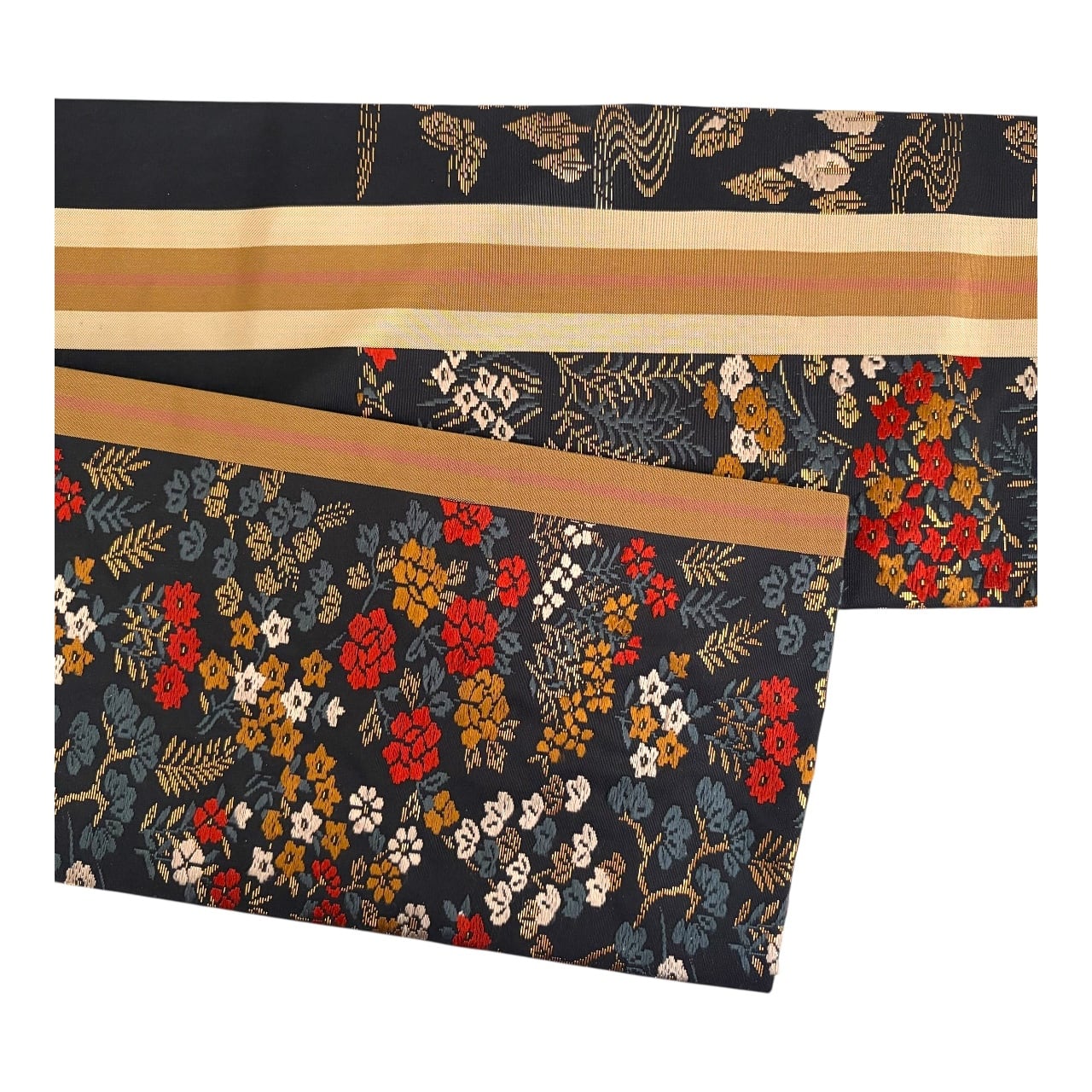 黒地に赤や金糸の四季折々の草花が一面に織り込まれた華やかな帯です。細かい柄なので柄の出方を気にすることなく着用頂けます。柄の端に大小のラインが通っています。ラインが目立たない方をお好みでしたら、手先から反対に巻いていただく必要があります。