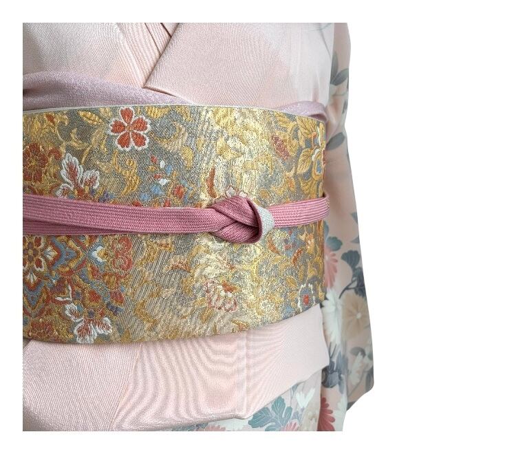 一本の袋帯をお太鼓部分と胴回り部分に切り離して作っています。簡単に着付けて気軽にお出掛けできるように作りました。
