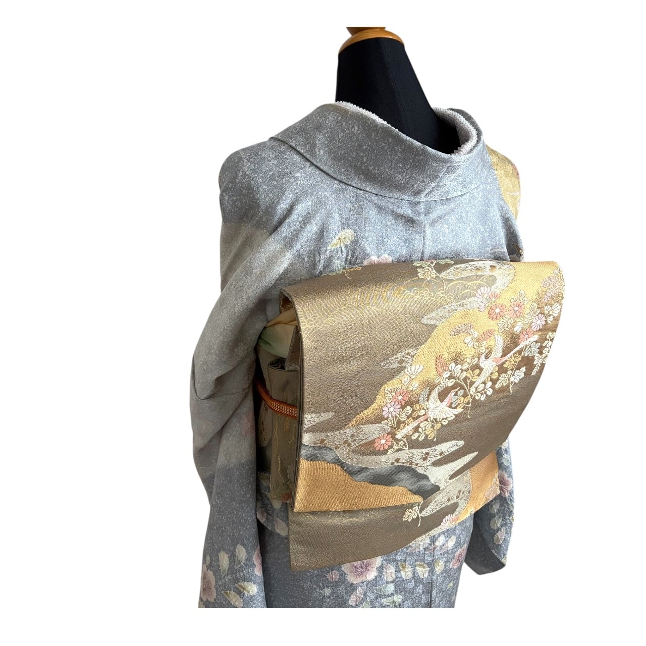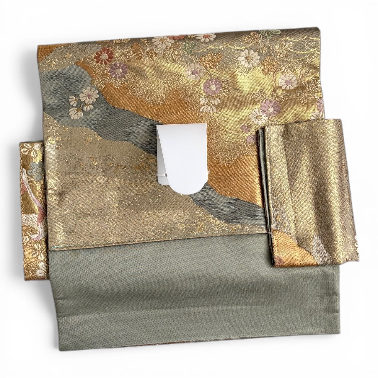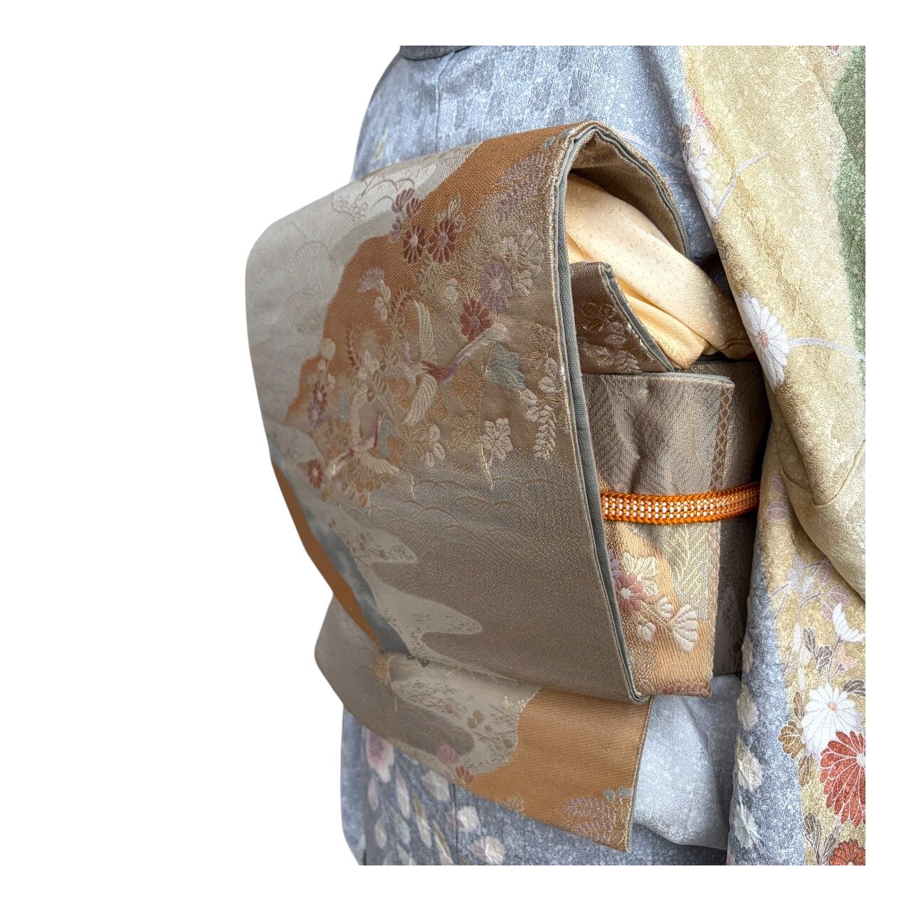 カーキと金の色調につがいの鳥と草花などが刺繍された帯です。留袖、訪問着・色無地など格式のある席に着用頂けます。