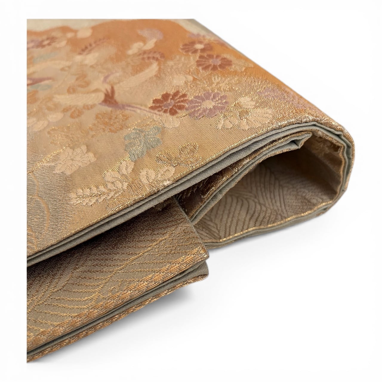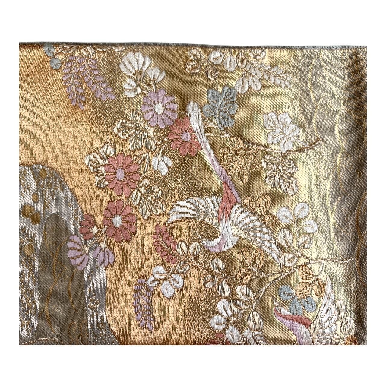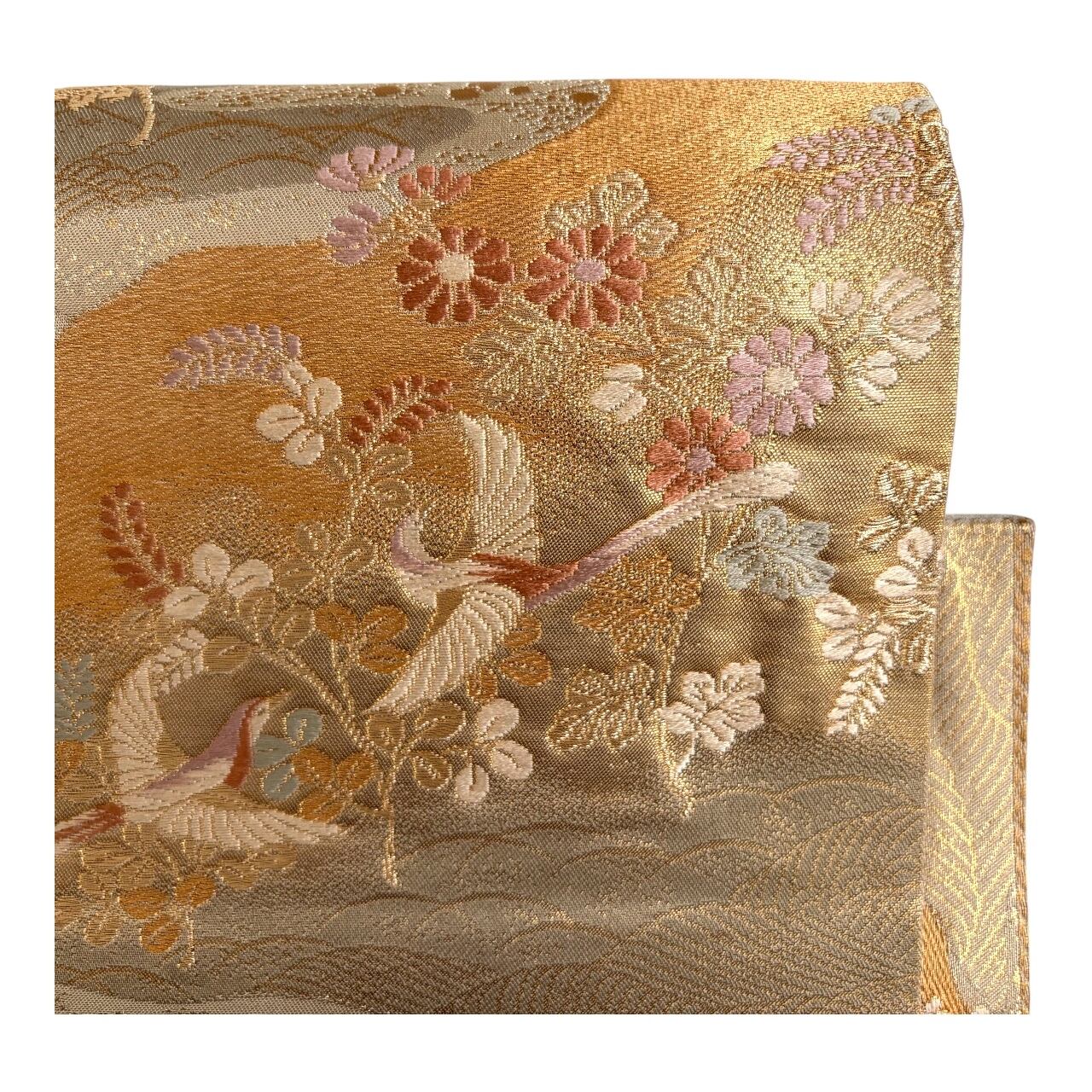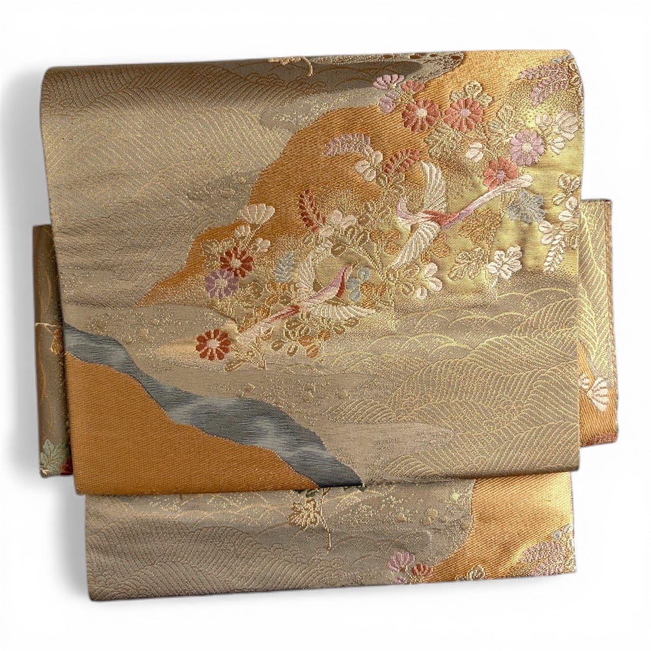 カーキと金の色調につがいの鳥と草花などが刺繍された帯です。留袖、訪問着・色無地など格式のある席に着用頂けます。