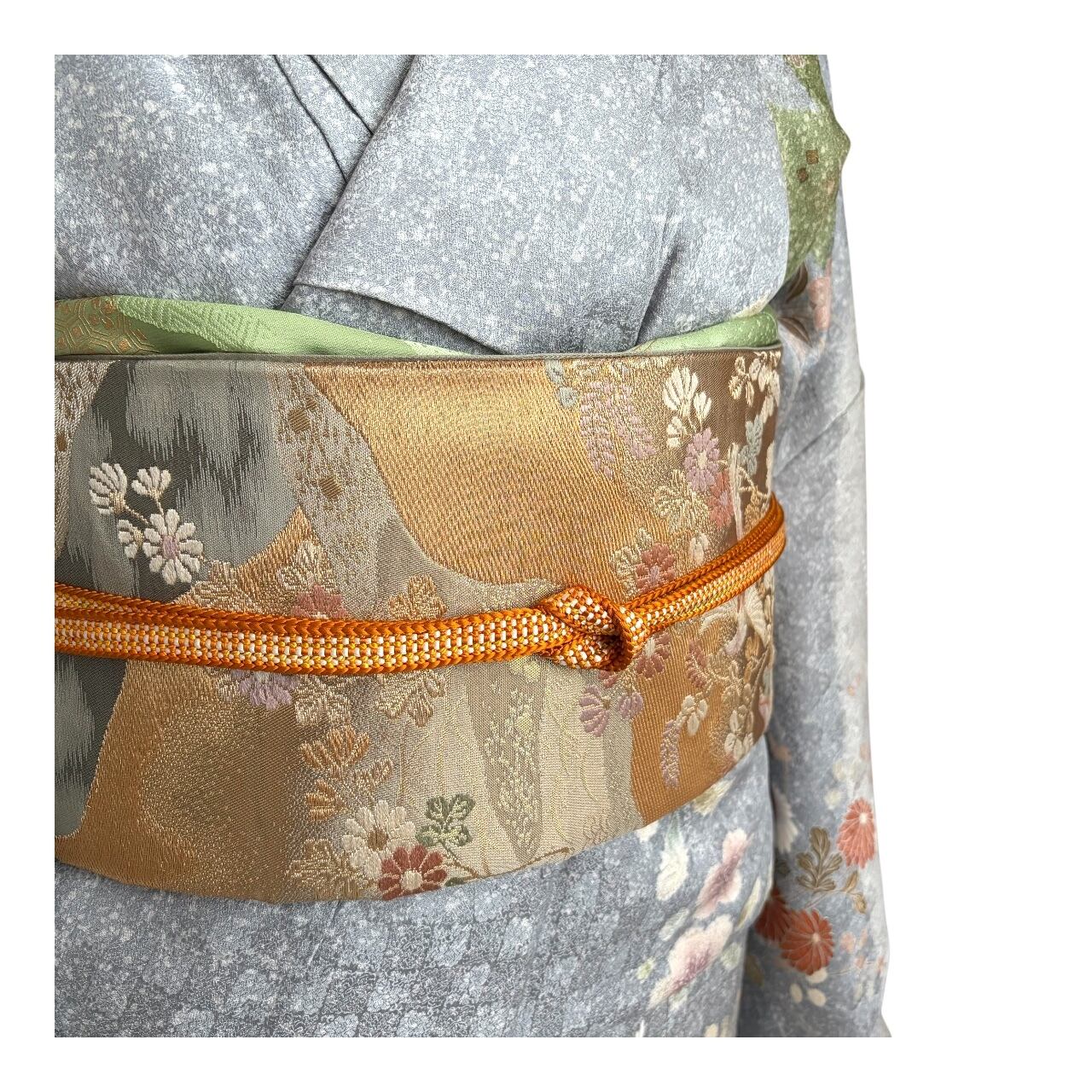 グレーのたたきの訪問着に合わせました。着物の中にあるひわ色と橙色に合わせた帯揚と帯〆でまとめました。