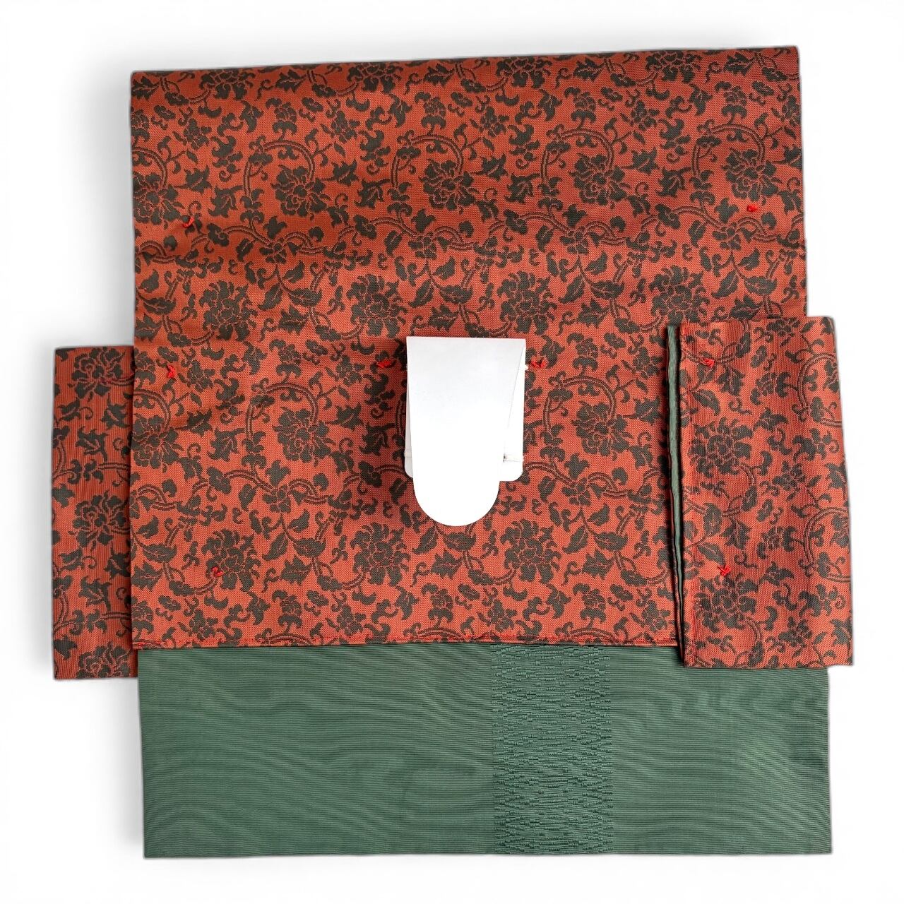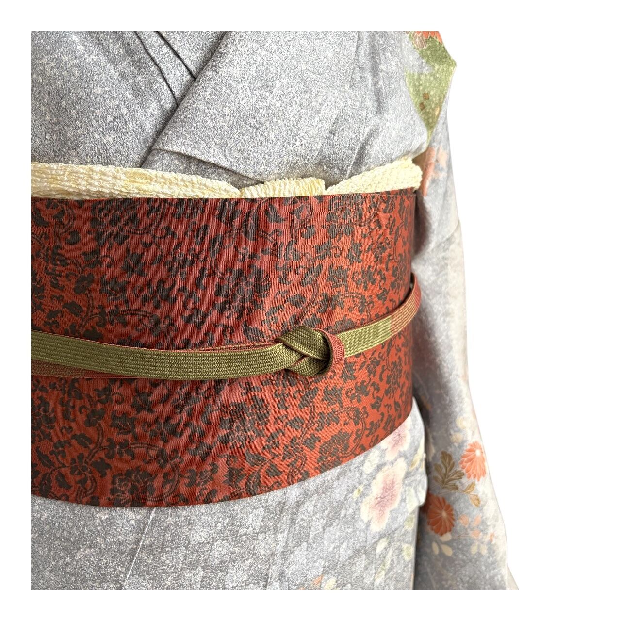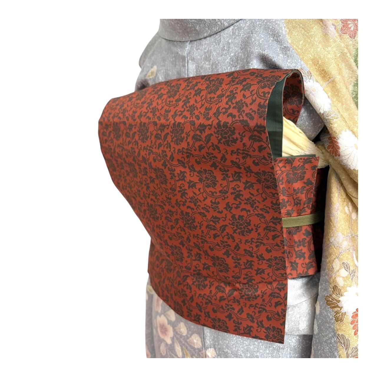 テラコッタのような色目に総柄のモスグリーンの花紋様、全通ですので柄が切れて無地になっている部分はありません。訪問着・付下げ・色無地などに合わせて着用頂けます。