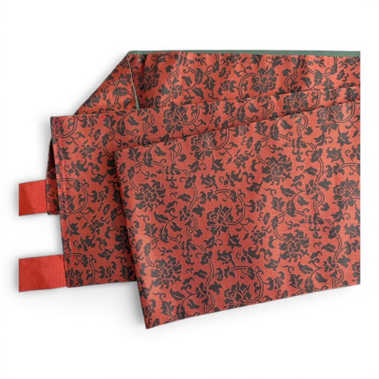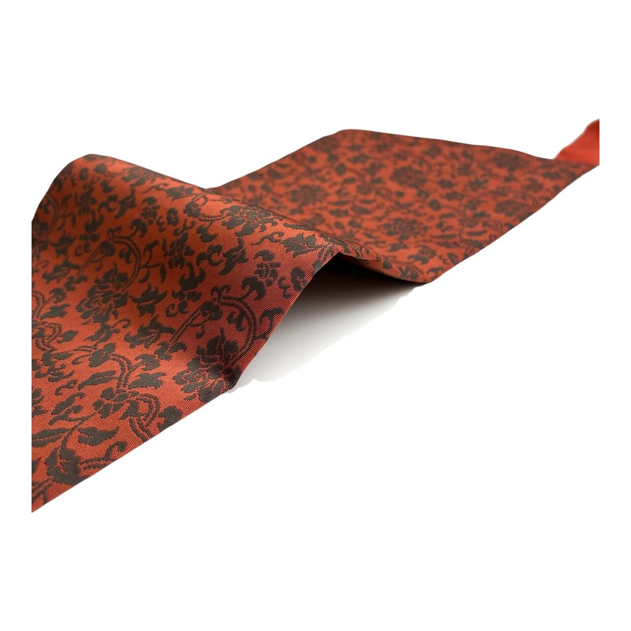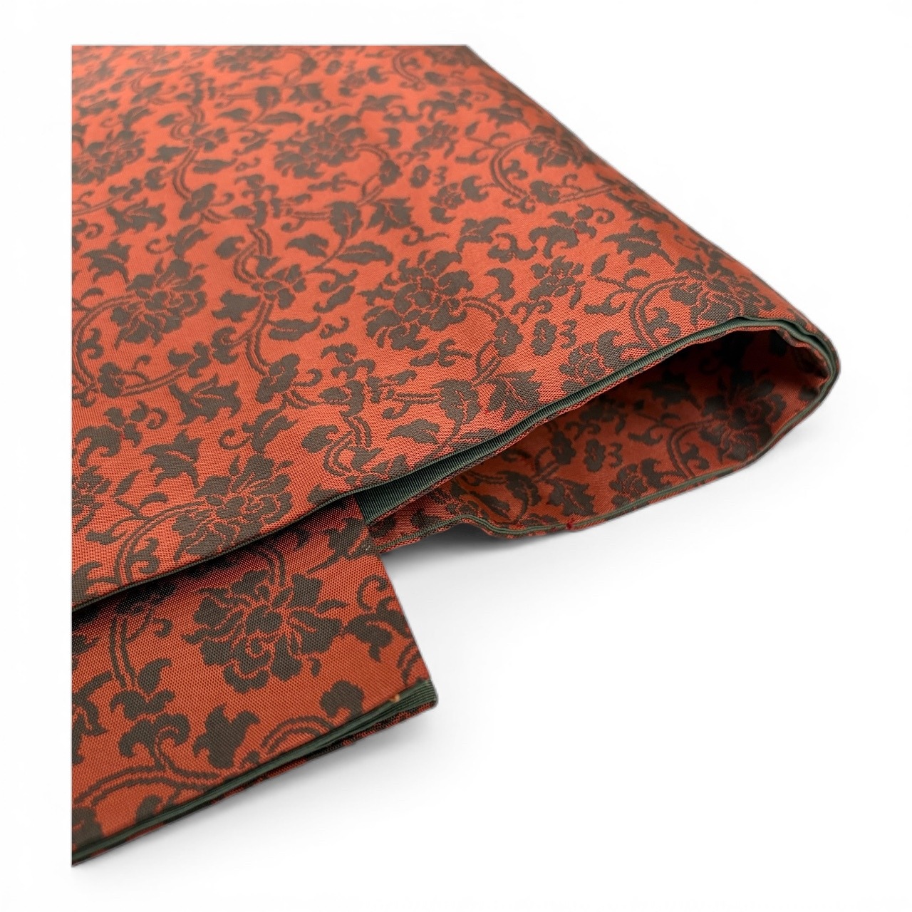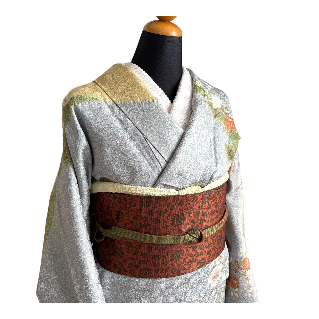 テラコッタのような色目に総柄のモスグリーンの花紋様、全通ですので柄が切れて無地になっている部分はありません。訪問着・付下げ・色無地などに合わせて着用頂けます。