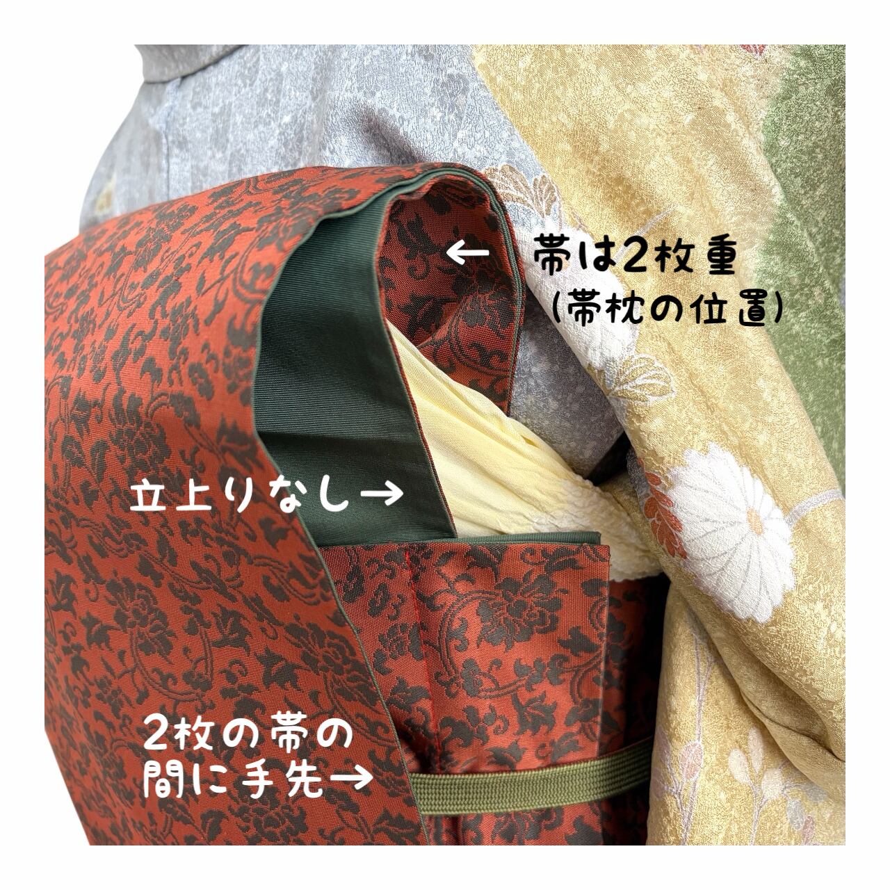 一本の袋帯をお太鼓部分と胴回り部分に切り離して作っています。簡単に着付けて気軽にお出掛けできるように作りました。