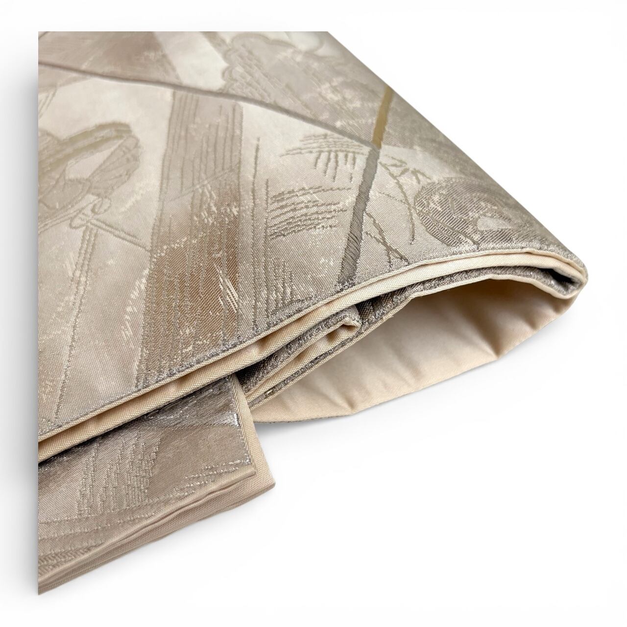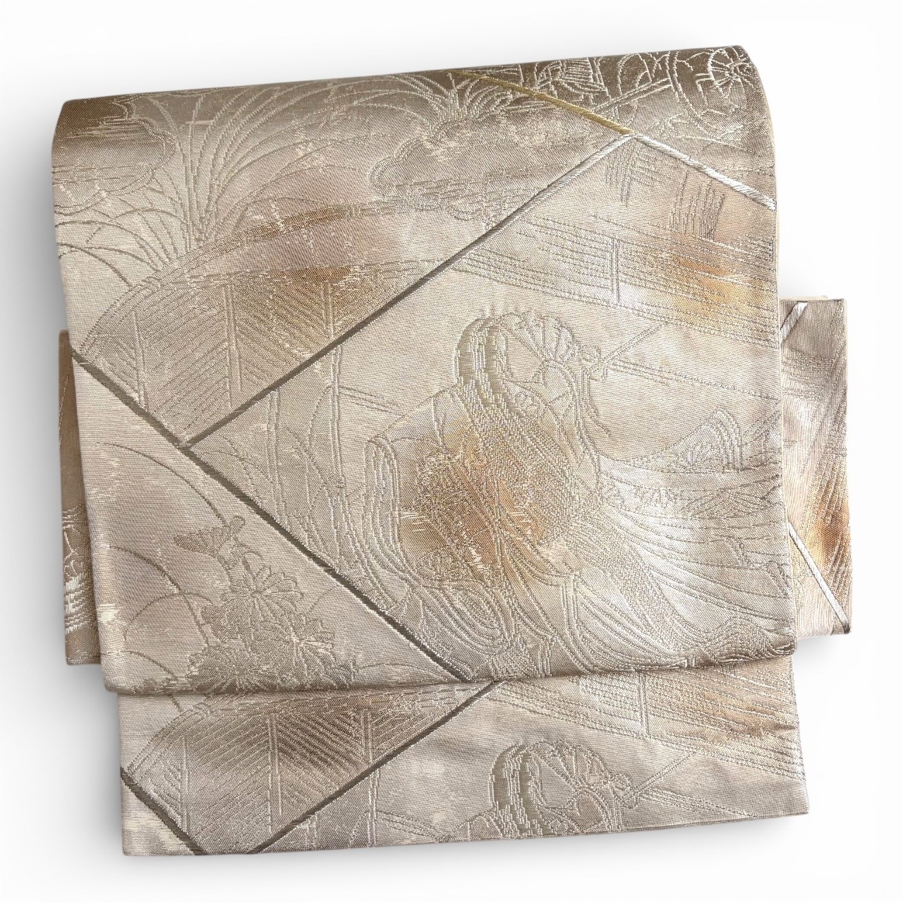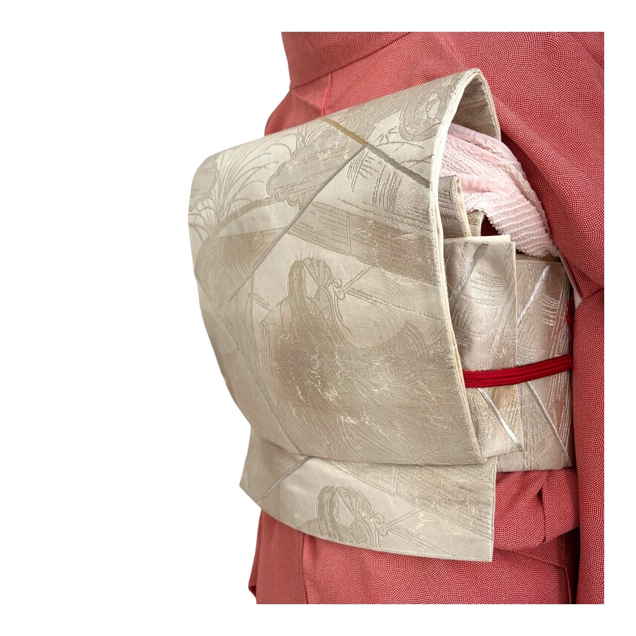 銀ベースに所々金糸の使われた帯です。遠目にはわかりづらいですが、よく見ると御所車や十二単のお姫様が織られています。留袖、訪問着・色無地など格式のある席に着用頂けます。