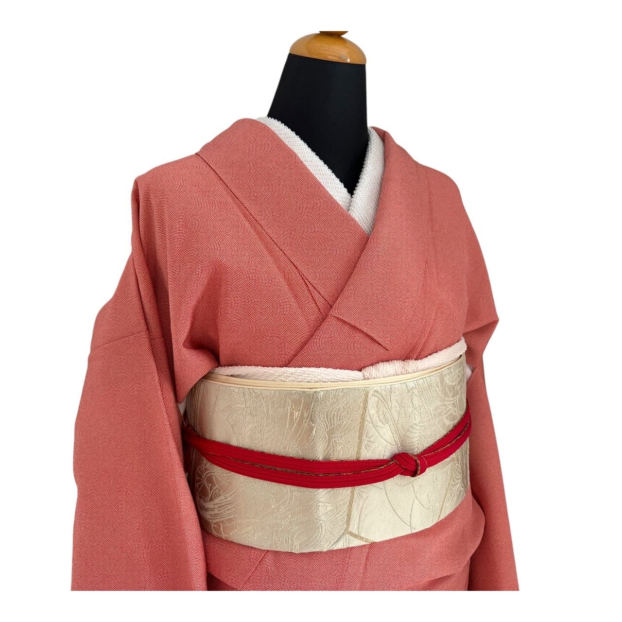 単色の帯で地味になりがちなので、赤の江戸小紋に合わせ沈みすぎないようにしました。淡いピンク系の帯揚、赤い帯〆をポイントにしました。