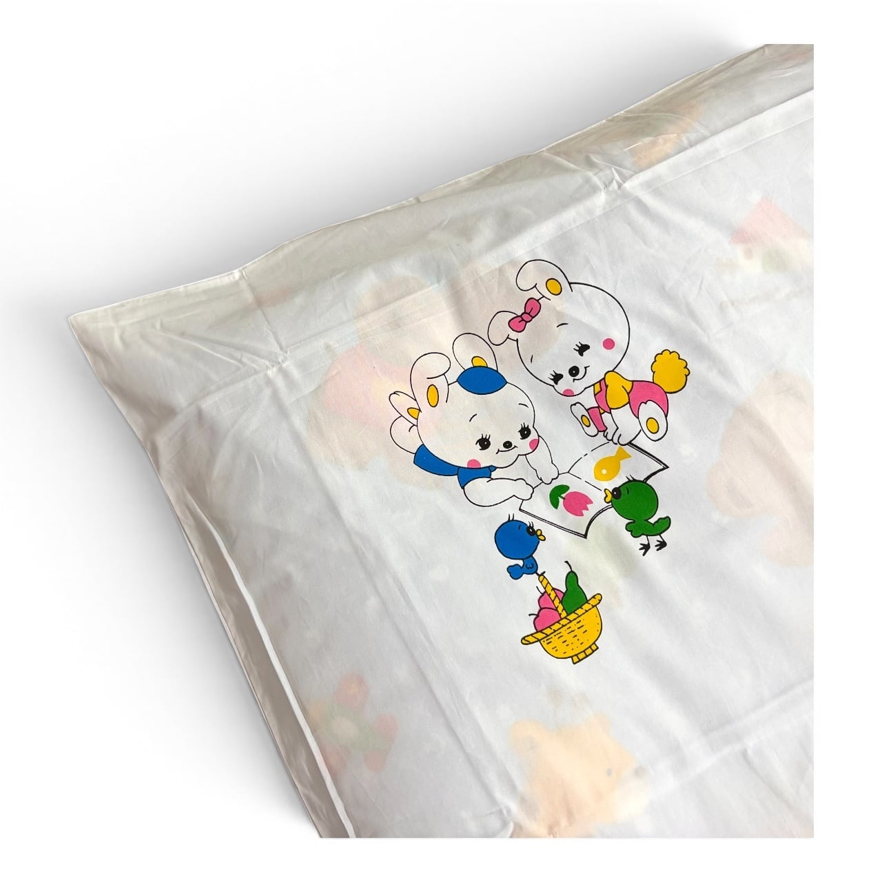 布団をすっぽり包むタイプ、サイドにファスナーが付いています。白ベースにレトロなウサギのワンポイントが可愛い懐かしいカバーです。