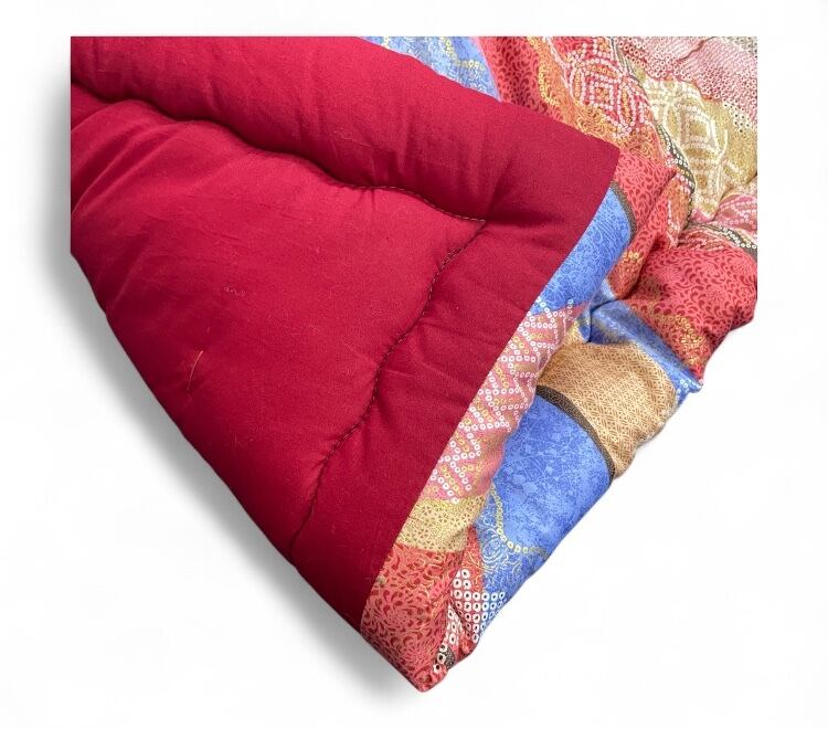 中綿がズレないように糸で一定箇所に留めがしてあります。布団の端は綿が空いてしまいやすいので一周グルリとミシンで押さえ縫いをしてあります。